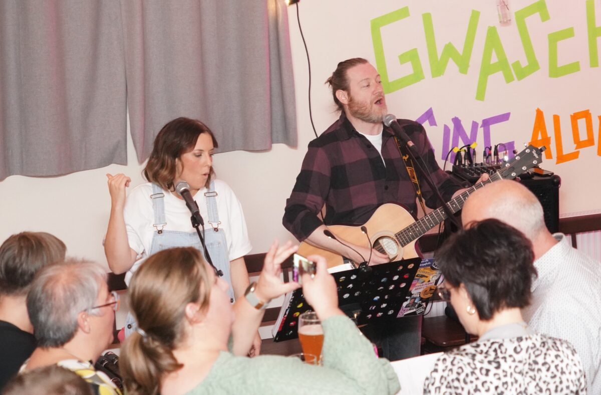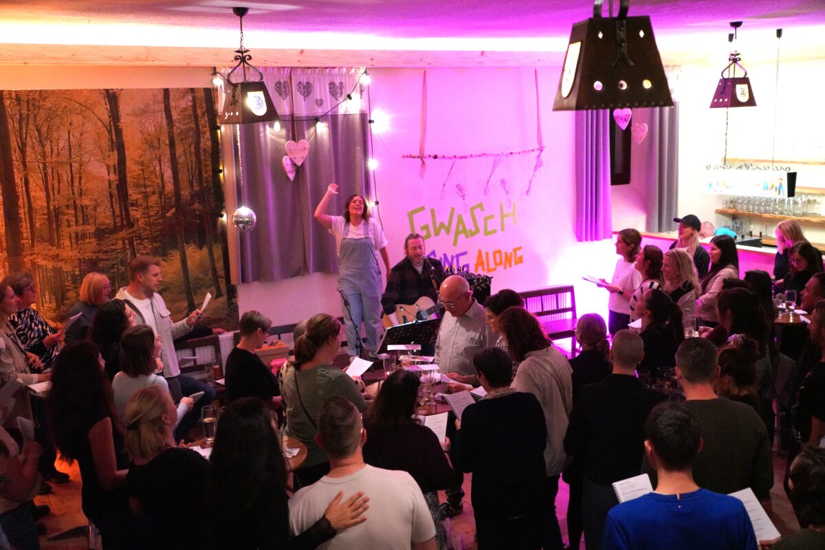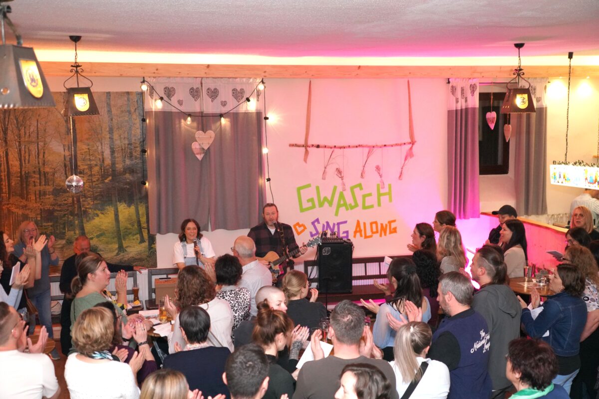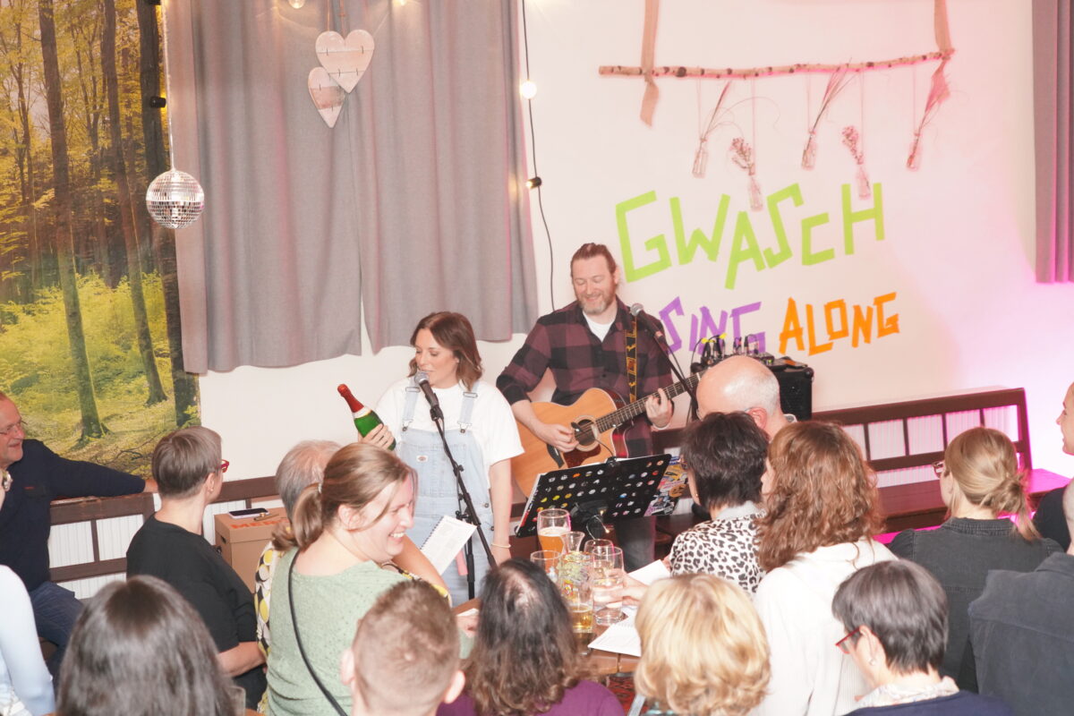 Statt auf einer erhöhten Bühne stand „Gwasch“ bei der fröhlichen Singparty auf einem alten Orientteppich mitten auf der Tanzfläche. So nah dran an den Menschen, wie es nur geht. „Die Leute sind heute der Chor“, erklärte Franzi Glaser, die sich selbstironisch als „Rampensau“ bezeichnet – und das Publikum nahm die Rolle mit Begeisterung an. Mit ausgeteilten Liedheften – die nur Texte, aber keine Noten enthielten – wurden die Gäste Teil der Show. Ob „Aahh“, „Oohh“ oder rhythmisches Klatschen: Per Handzeichen gab das Duo die Einsätze und der Saal sang aus voller Kehle.