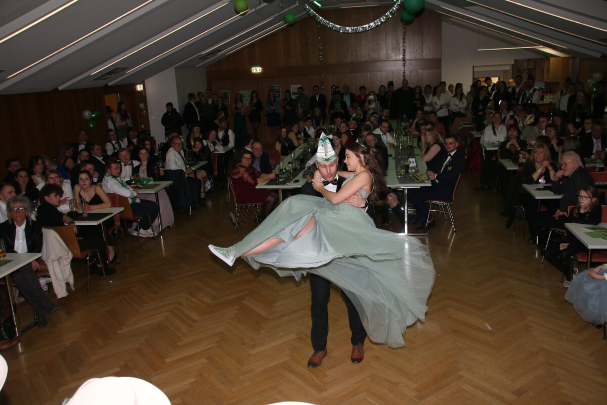 Wichtiger war, dass die Bewegungen im Saal saßen. Das Prinzenpaar Patrick Künneth und Stefanie Herbert hatte extra eine Tanzschule besucht und hatte sichtlich Spaß am Tanz. Die beiden sind auch privat ein Paar und sie verraten, dass es Stefanies Wunsch gewesen war, das Prinzenpaar zu machen. Sie trainierten drei Wochen für ihren großen Auftritt und hatten gerade noch Glück: Patrick spielt Fußball beim FC Vorbach und hat sich zuvor noch das Syndesmoseband gerissen. Rechtzeitig zur Faschingssaison wurde er aber wieder fit. Ob sie denn aufgeregt seien? „Wir haben uns die Nervosität schlimmer vorgestellt“, sagen Stefanie I. und Patrick I. im Chor. Vielleicht half aber auch der Besuch der Bar direkt vor ihrem Eröffnungstanz.