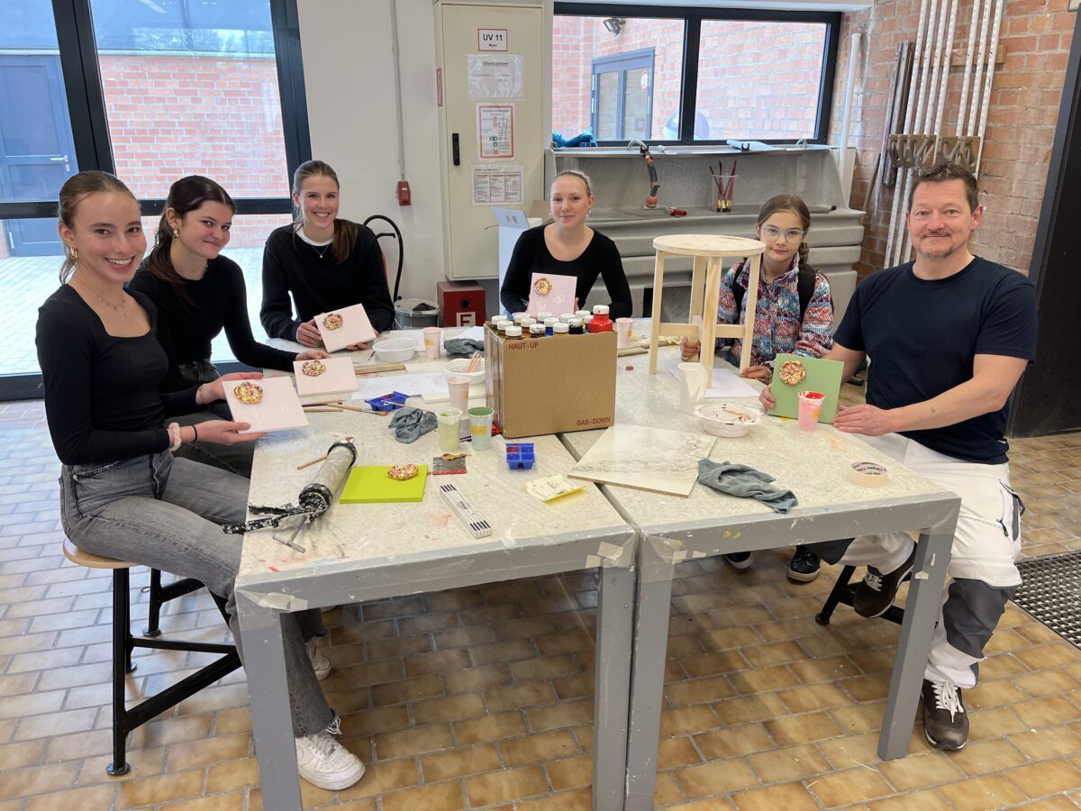 In den Werkstätten der Maler und Lackierer bemalten und vergoldeten sie eine Stuckrose. In der Schreinerwerkstatt fertigten sie einen Holzhocker an und lernten dabei unterschiedliche Techniken der Holzbearbeitung kennen wie Sägen, Bohren, Leimen und Dübeln.