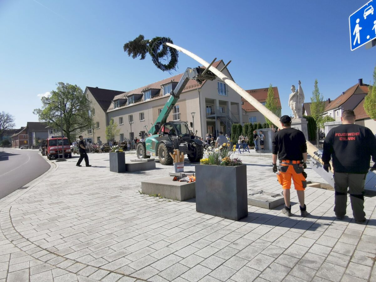 Auch die Marktgemeinde Eslarn bereichert seit Jahrzehnten ein Maibote. Die 26 Meter lange Fichte besorgte am frühen Morgen eine Abordnung der Freiwilligen Feuerwehr (FFW). Für das Schmücken mit Kränzen und blauweißen Bändern und das Aufstellen zeichnete in enger Zusammenarbeit ein rühriges Team verantwortlich. Jeweils 10 Mitglieder stellte die FFW um Kommandant Georg Rauch und der SPD-Ortsverein um Vorsitzenden Marktrat Georg Zierer. Unterstützung leisteten nicht zuletzt drei Bauhofmitarbeiter. Den separat angebrachten grünen Baumwipfel mit den blauweißen Bändern verstärkten die Akteure zur Sicherheit mit Eisenbändern.