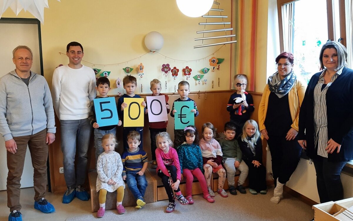 Die beiden KoKi-Mitarbeiter Norbert Meister und Michael Simmerl dankten bei der Übergabe für das Engagement von Elternbeirat, Kindertagesstätte und Kindern. „Das Geld können wir sehr gut einsetzen, um Familien in schwierigen Lebenslagen zu unterstützen“, betonte Simmerl. Als kleines Dankeschön überreichten Meister und Simmerl das Landkreis-Maskottchen Storch Ferdinand an die fleißigen Spendensammler.