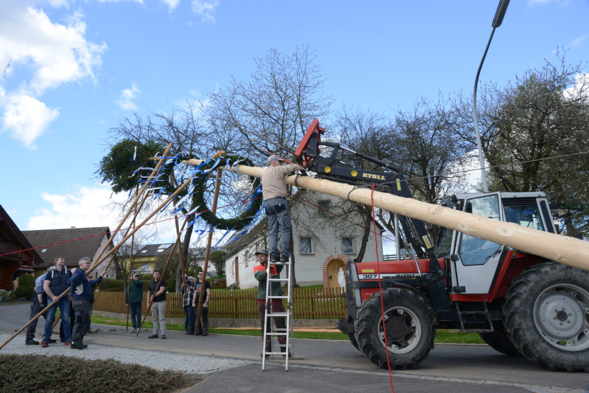 Doch der Baum hielt alle Belastungen aus, nachdem er mit dem Kran hochgehoben und in die Halterung gebracht worden war. In Vöslesrieth waren kräftige Arme gefragt, die mit kleiner maschineller Unterstützung den Baum in die Höhe hievten. Geschmückte Kränze verliehen den Maibäumen in Pleystein und Vöslesrieth zur ebenfalls geschmückten Krone ein buntes Aussehen.
