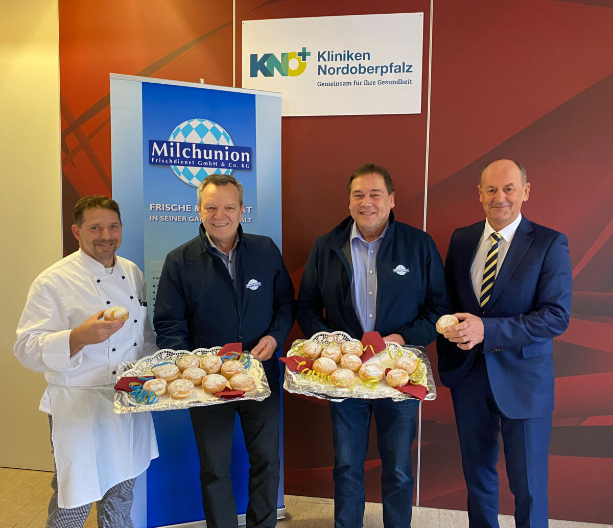 Josef Plank und Christian Regner von der Milchunion Weiden (Mitte) spendeten insgesamt 3.000 Krapfen für die Patientinnen und Patienten sowie alle Beschäftigten der KNO. Dafür bedankten sich Karl Wittmann (rechts) und Küchenchef Ronny Hinderlich (links). Foto: Kliniken Nordoberpfalz, Michael Reindl