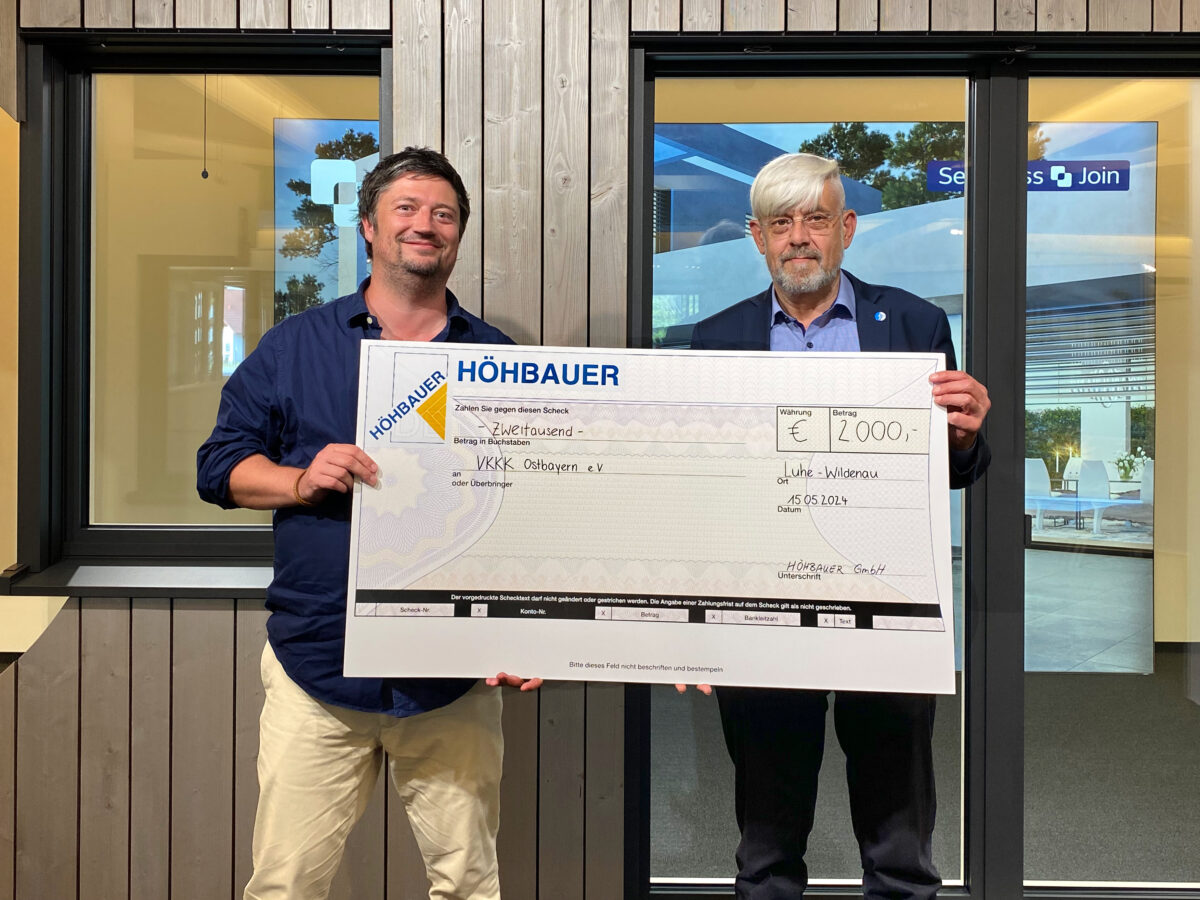 Die HÖHBAUER GmbH aus Luhe-Wildenau, bekannt für ihr starkes Engagement in sozialen und gemeinnützigen Projekten in der Region, setzt ihre Tradition fort, indem sie dieses Jahr eine Weihnachtsspende in Höhe von 2.000 Euro an den VKKK Ostbayern e.V. überreicht hat. Im Beisein von Geschäftsführer Christoph Höhbauer und VKKK-Beirat Michael Gradl fand die Übergabe in den Ausstellungsräumen von HÖHBAUER statt und brachte trotz Mai-Wetter weihnachtliche Stimmung.
