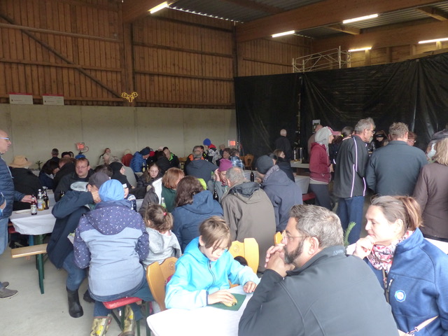 So konnten sich Besucher, nahezu 1500 an der Zahl, die herrliche Aussicht weit über die Gemeindegrenze hinaus genießen. Sogar der Wettergott hatte ein Einsehen und erst am Ende des Hoffestes, am Abend, kamen die ersten Regentropfen. In der Halle konnten sich die vielen, vielen Gäste beim Mittagessen, Gegrilltem, frischen Waffeln, Kuchen und Torten und den verschiedensten Getränken stärken, und die Plätze waren stets belegt. An den Ess- und Trinkständen bildeten sich lange Schlangen, und der Erlös dieses Hoffestes kommt auch in diesem Jahr der Kinderkrebshilfe zugute.