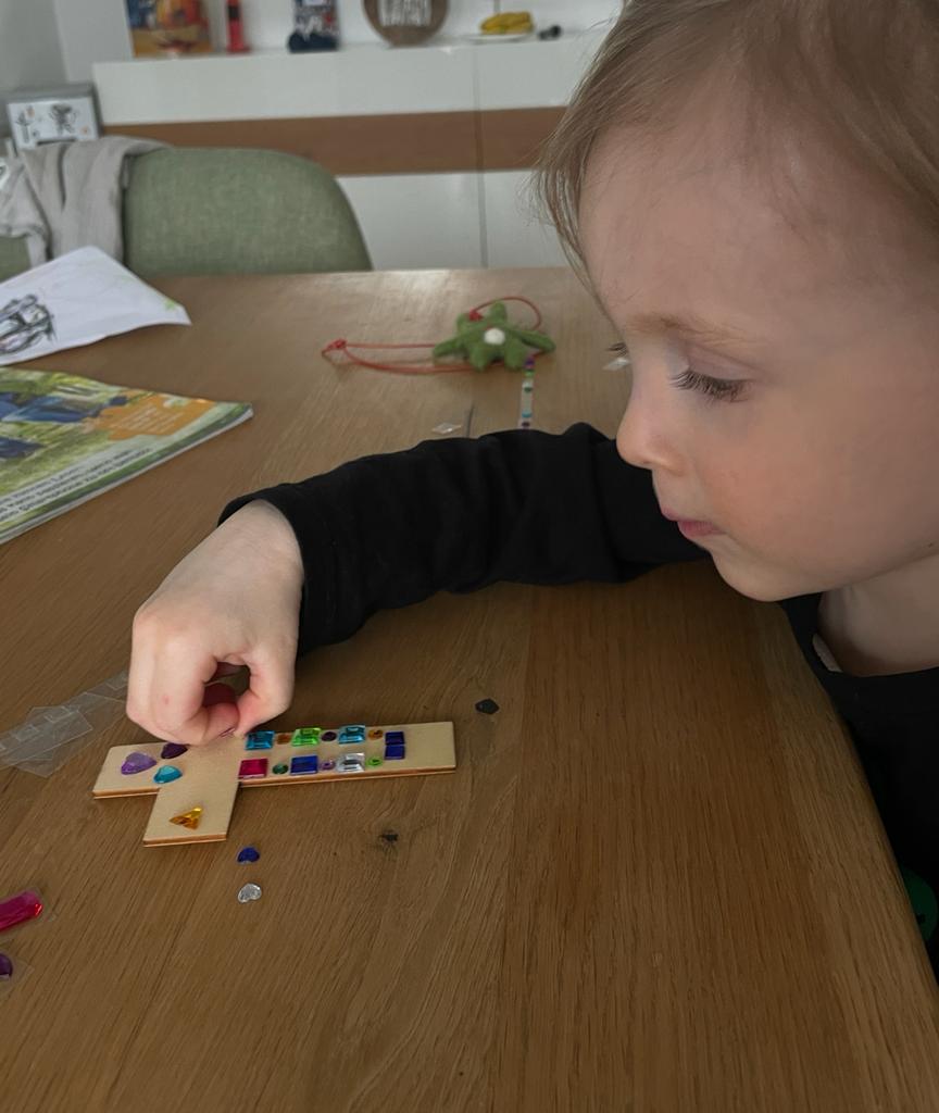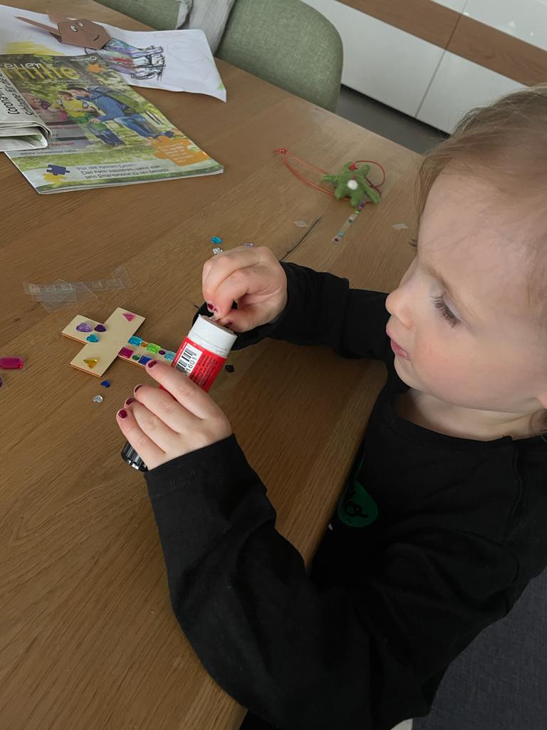43 Neustädter Kinder im Alter von drei bis 13 Jahren bastelten jeweils zu Hause für Ostern kleine, mit Klebepailletten besetzte Holzkreuze. Sie hatten vom Team „Junge Familien“ der Neustädter Kolpingsfamilie Bastelpakete mit je einem Holzkreuz mit Aufhänger, Klebepailletten, einem Gebetszettel und Schokoeiern erhalten.