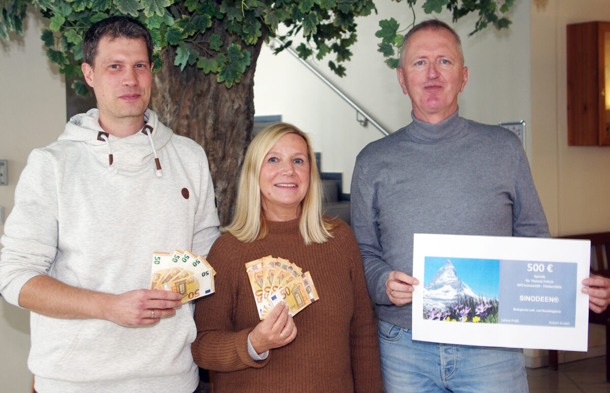 Robert Gruber von der Firma SINODEEN aus Kirchdorf am Inn und Sabine Prößl überreichen an den Verein HPZ RehaSport e. V. jeweils 250 Euro.