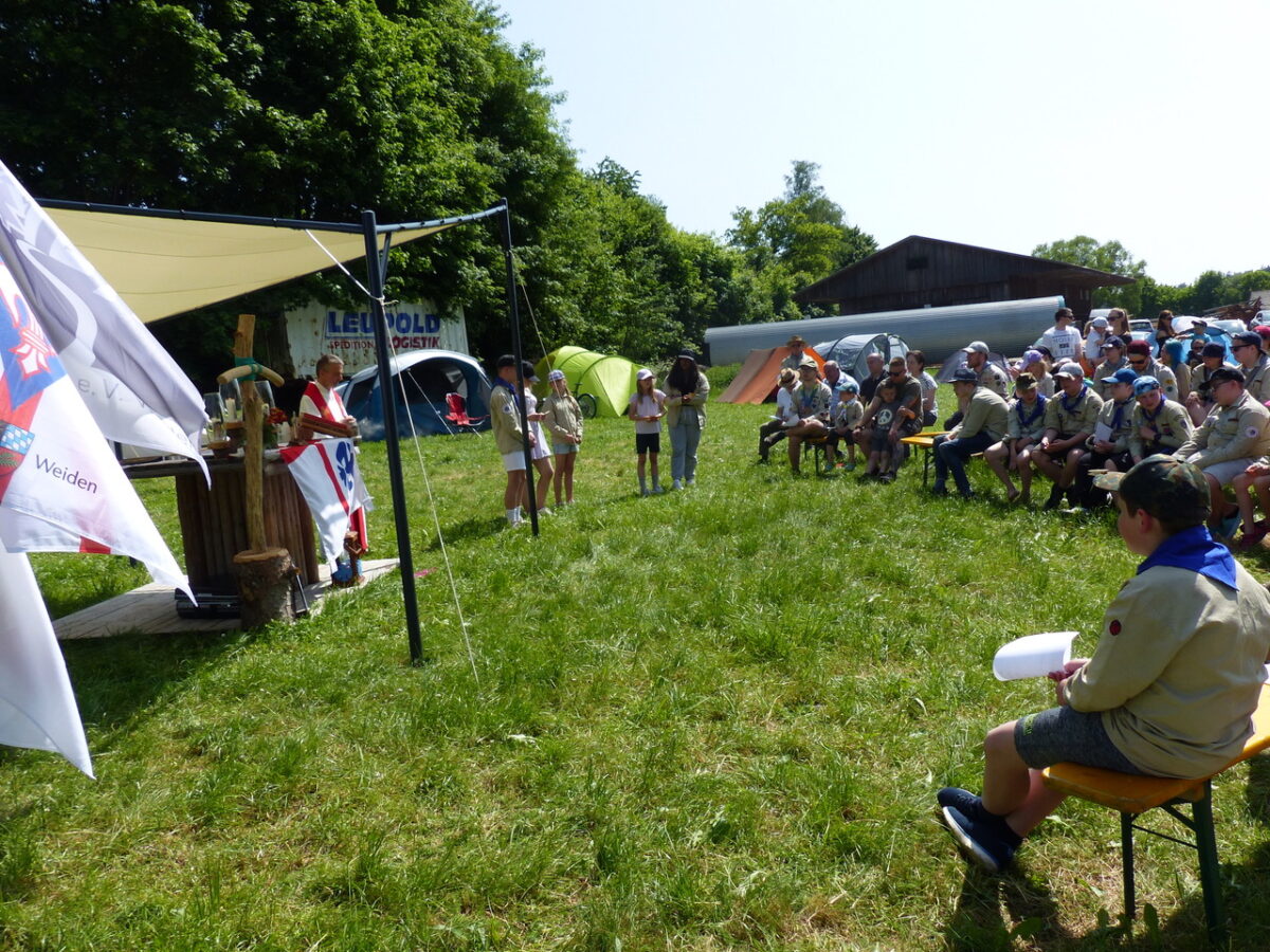 Über 100 Pfadfinder, Kinder, die Kleinsten sind vier Jahre, mit ihren Eltern und Jugendlichen sind versammelt. Sie sind nicht nur aus Weiden, sondern kommen auch aus dem gesamten Landkreis Neustadt/WN. Sie haben hier auf der Wiese hinter dem Sägewerk Stahl ihre Zelte aufgeschlagen. Sowohl Einzelzelte als auch große Gemeinschaftszelte bilden das Lager.