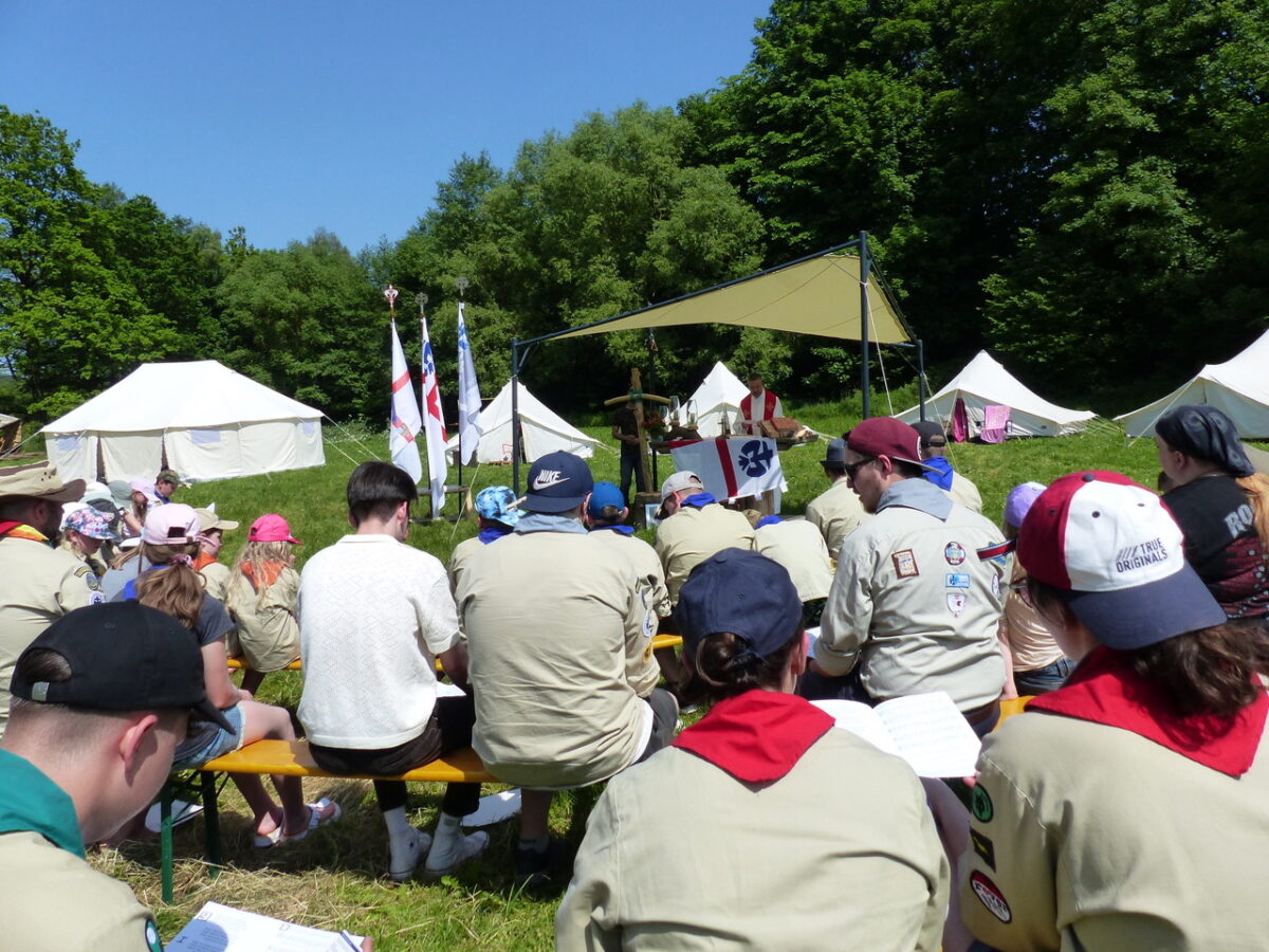 Am Pfingstsonntag-Nachmittag versammelten sich alle um den Altar, der eigens für die Messfeier aufgebaut wurde. Stadtpfarrer Markus Schmid von St. Josef Weiden ist persönlich zur Kainzmühle gekommen und feierte mit den Pfadfindern das Pfingstfest. In seiner Predigt stellte er heraus, was denn das Pfingstfest und der Heilige Geist sei. An Bespielen, wie mit einer Feder oder eine mündliche Aufforderung, erklärte er den Heiligen Geist und band vor allem die Kinder mit ein. „Das alles sorgt für Bewegung und das ist nur mit dem Geist möglich“, so der Priester.