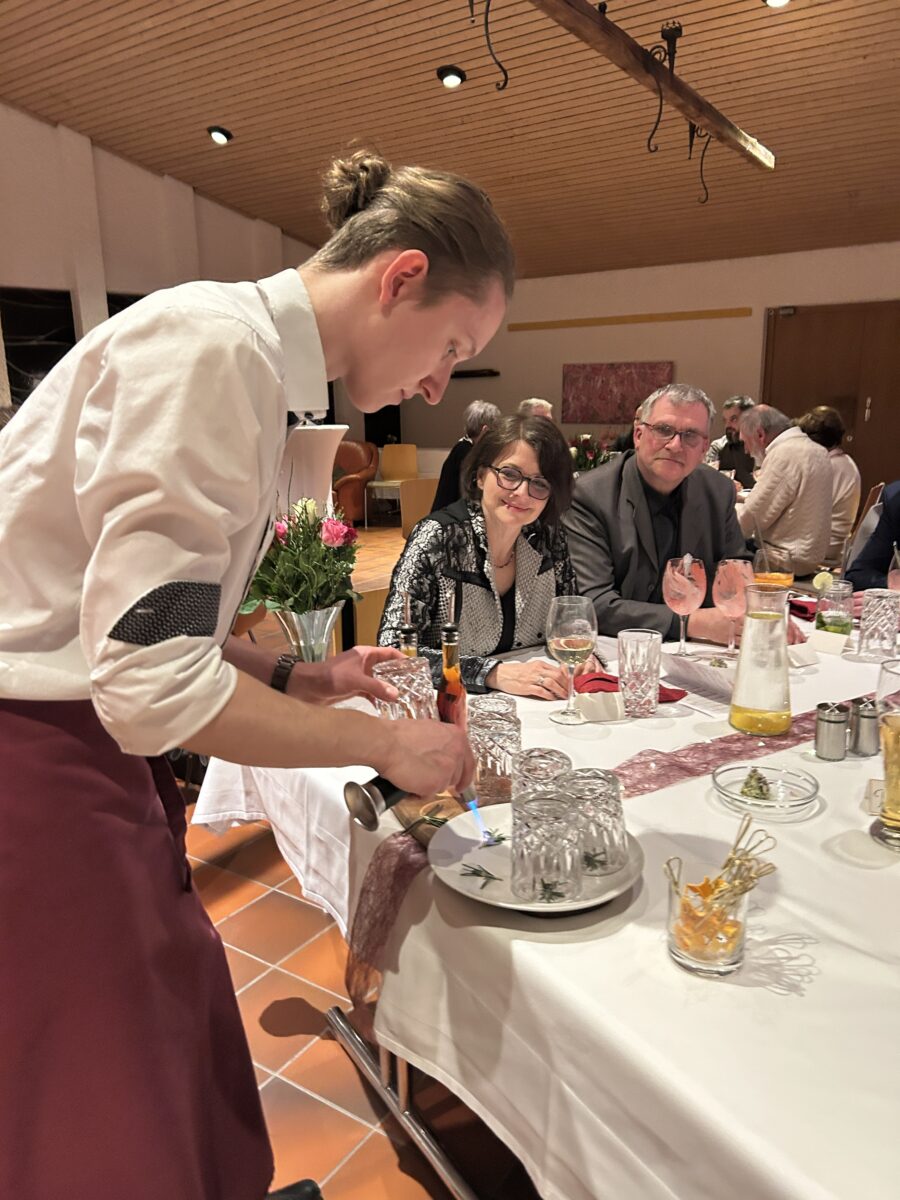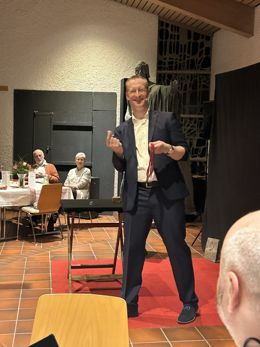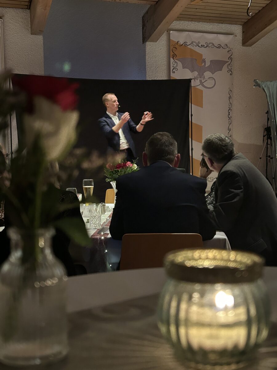 Zwischen den Gängen begeisterte Zauberkünstler Jörg Spengler das Publikum mit seiner Show. Mit Charme, Wortwitz und verblüffenden Illusionen zog er die Gäste immer wieder in seinen Bann. Karten, Gedanken und sogar Wahrnehmungen schienen unter seinen Händen zu verschmelzen – Staunen und Applaus erfüllten den Rittersaal.