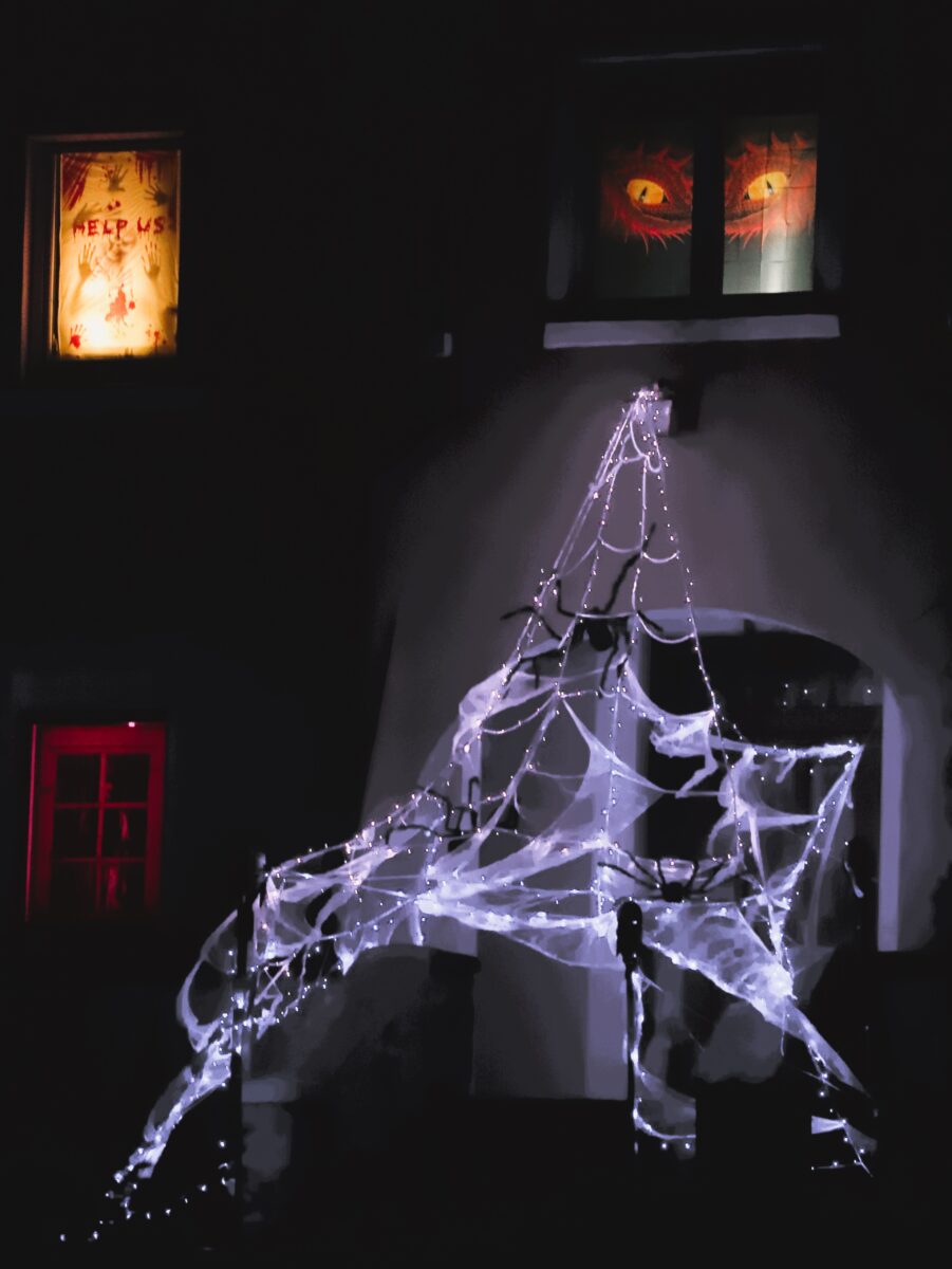 Die attraktivsten Bilder von und mit den „schrecklich schönen“ Figuren und Gebilden entstehen natürlich bei Dunkelheit. Ein zentraler Eyecatcher ist die zurzeit nicht begehbare Außentreppe mit dem riesigen Spinnengewebe vor der Haustür zu dem mittigen Turm vor dem alten Forstverwaltungsgebäude oder die drei überlebensgroßen Gestalten im oberen Bereich.