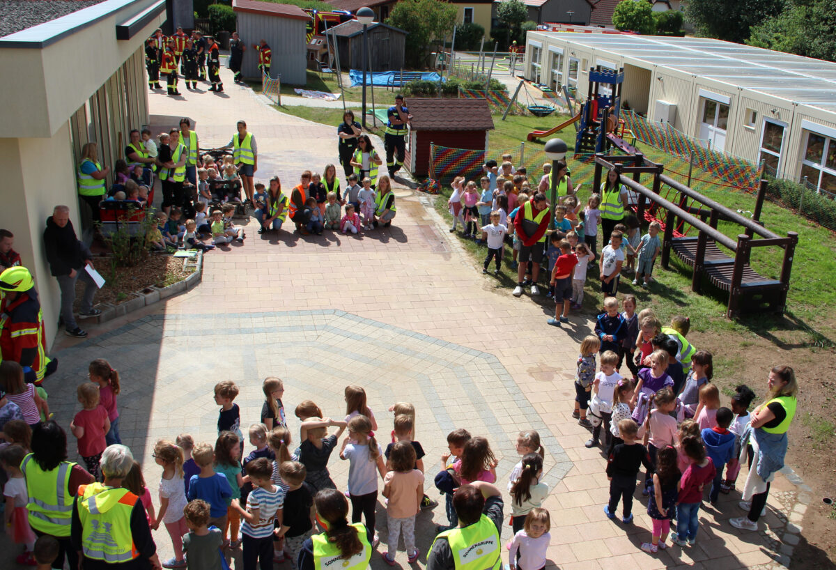 Die Gegebenheiten im Kinderhaus haben sich mit dem Bau der Containeranlage verändert. Noch mehr Kinder besuchen die Einrichtung. Daher war eine Übung für Kinder, Kinderhaus sowie der Feuerwehr wichtig.
