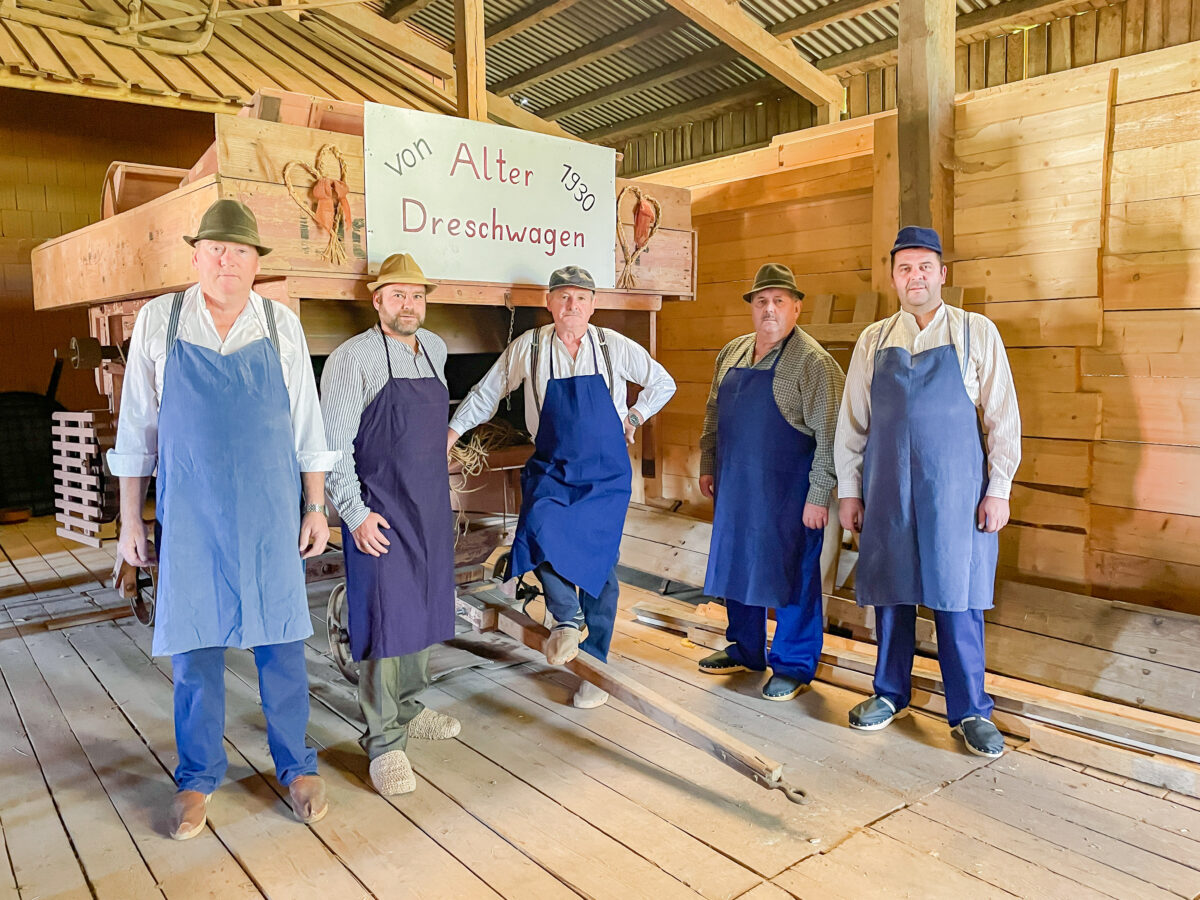 Funken von Staubkörnern tanzen im schmalen Licht der Fenster, während von draußen Sommerluft hereinweht. Doch hier drinnen scheint die Zeit um hundert Jahre zurückgedreht: Holzschuhe klappern, Leinenhemden sind von Schweiß verfärbt, der blaue Arbeitsschurz baumelt, Strohhaufen türmen sich, das Bier schmeckt. Die fünf Männer – Josef Prieschenk, Michael Thaler, Josef Hörl, Josef Wöhrl und Martin Wöhrl – sind mit voller Hingabe bei der Sache. Sie „proben“ für den historischen Erntedankzug am 14. September in Kastl. Dort werden sie zeigen, wie Generationen vor ihnen in den langen Wintermonaten das Getreide aus den Ähren schlugen.