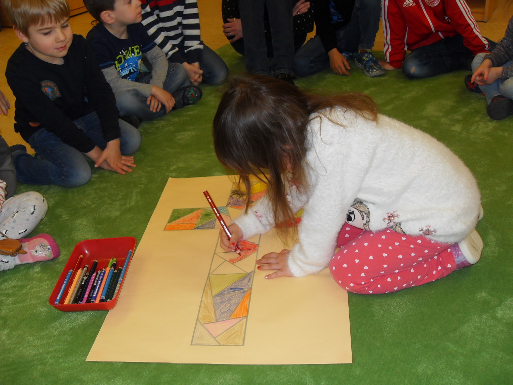Gerade jetzt nimmt die religiöse Erziehung einen großen Stellenwert in der pädagogischen Arbeit ein. Den Kindern wird die Ostergeschichte nahegebracht und verdeutlicht, warum wir überhaupt das Osterfest feiern. Religiöse Lerneinheiten werden durch Legearbeiten veranschaulicht, auf der die einzelnen Stationen der Karwoche aufgebaut werden.
