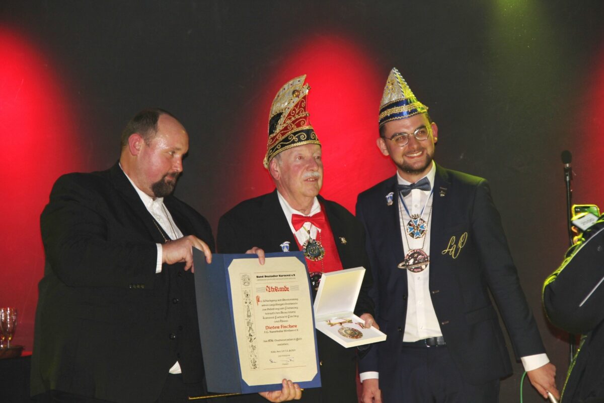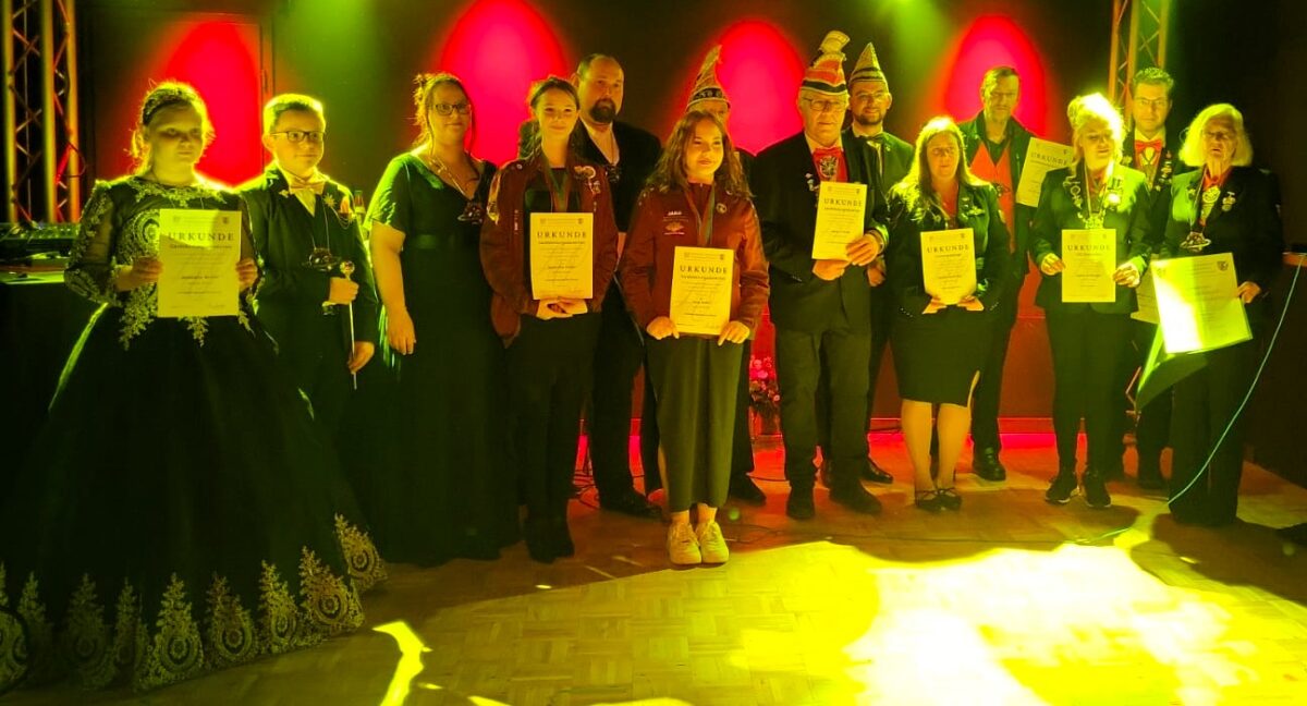 Als zweites Highlight des Abends ehrte Regionalpräsident Fabian Bonczyk verdiente Aktive. Anastazja Szincel, Samantha Simon, Lena Maier, Heinz Stritzke, Raimund Benkner und Matthias Stumpf erhielten das Gardeleistungsabzeichen in Bronze, Kerstin Ramming die Elferrats-Spange in Silber. Selina Sulzberger wurde mit dem Gardeleistungsabzeichen in Gold mit Steinen und der Zahl zwanzig sowie dem LVO-Ehrenorden und Monika Sulzberger mit dem LVO-Steckkreuz ausgezeichnet. Dieter Fischer hat mit dem BDK-Orden in Gold eine besondere Ehrung durch den Bund Deutscher Karneval erhalten.