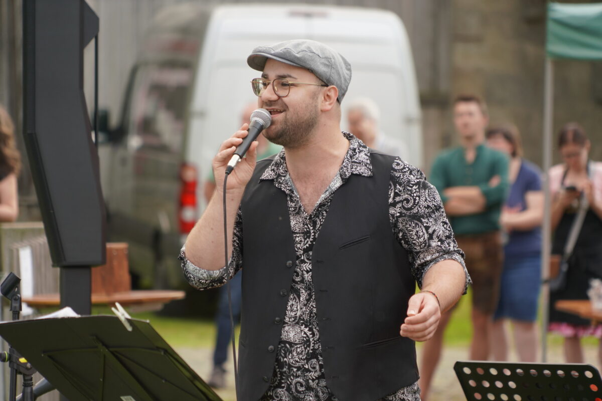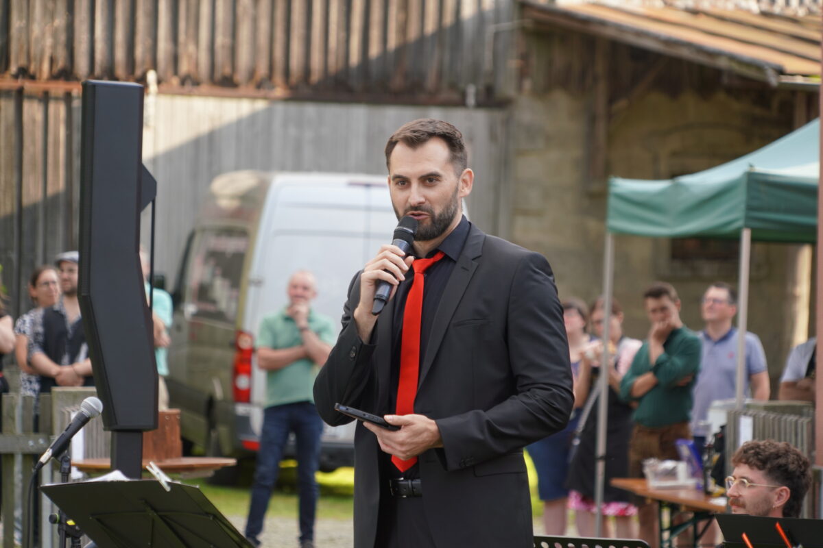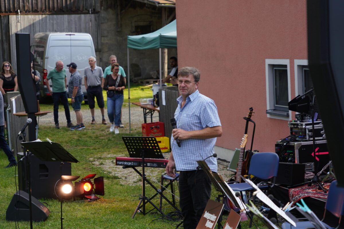 Zum Zungenschnalzen war der Gesang von Nathalie Bauer und des Waldthurners Johannes „James“ Pflaum, der in Nürnberg Musik studiert und seit über fünf Jahren eine der Stimmen der Forchheimer BigBand ist. Pflaum fühlte sich in seiner Heimat pudelwohl und zeigte voller Stolz vor den Einheimischen und seiner vollzählig aus Waldthurn nach Albersrieth gekommenen Familie sein bemerkenswertes gesangliches Können. Sinnigerweise war dessen Vater, Josef Pflaum sen., der Organisator des Abends. Er meinte, LandKULTUR Waldthurn habe eine Big-Band für das diesjährige Sommerprogramm gesucht und die Swingaraiders BigBand habe einen Auftritt außerhalb des Großraums Forchheim gesucht. So habe man sich gefunden. Die Band spielte einen Mix aus populärem Swing, Jazzstandards, deutschen und internationalen Popklassikern, Soul, Balladen und Musical-Nummern.