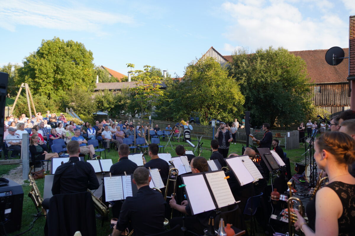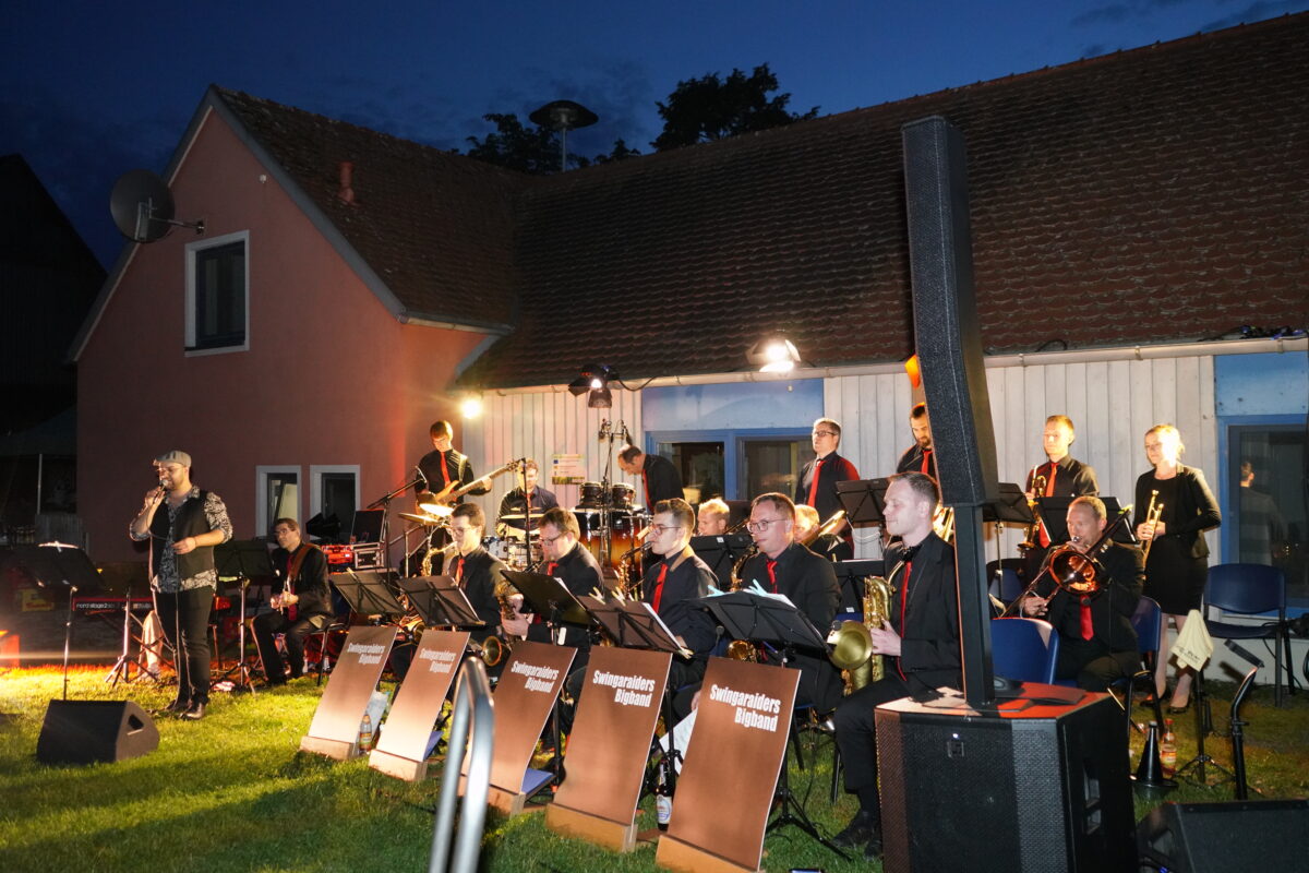 Die Swingaraiders BigBand aus Forchheim hatte nicht auf der Bühne, sondern mit dem Rücken zum Dorftreff in der Wiese im Albersriether Generationengarten Platz genommen. An diesem frühen Abend zeigte sich wieder die Vielfalt des „LANDkultur Waldthurn“-Programms. Die 17 Musiker sowie die Musikerin und die beiden Sänger zeigten, was eine Big Band an mitreißendem Swing bieten kann. Die Forchheimer waren in typischer Big-Band-Besetzung nach Albersrieth mit Saxophonen, Posaunen, Trompeten, Schlagzeug, Bassgitarre und Keyboard gekommen.