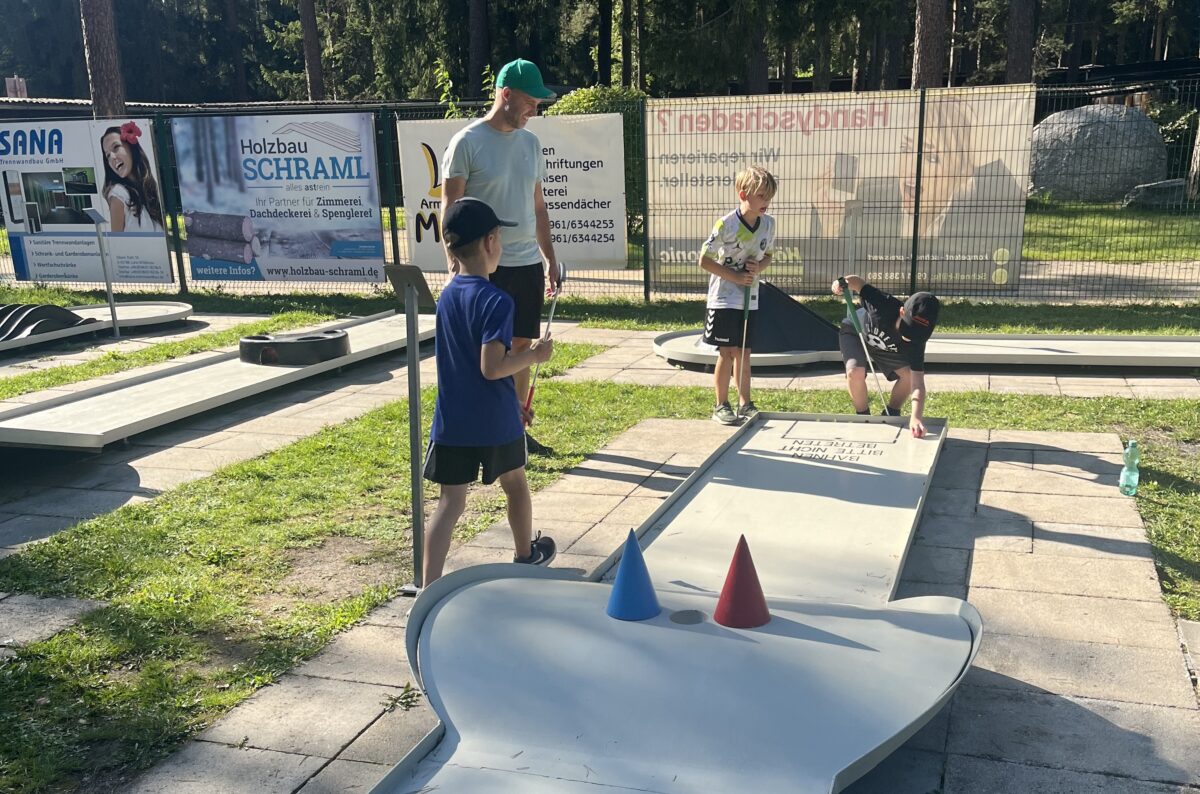 Auf den 18 Bahnen zeigten die Kinder, wie gut sie mit dem Schläger umgehen können. Aufgeteilt in zwei Gruppen absolvierten die Buben und Mädchen die Golfbahnen mit viel Geschick. Meist reichten eine oder zwei Schläge bis ins Loch. Trotz großem Ehrgeiz aller Kinder stand dabei zu jeder Zeit der Spaß im Vordergrund. Ein Eis, das die Gemeinderäte spendierten, schleckten die Kinder mit Genuss.