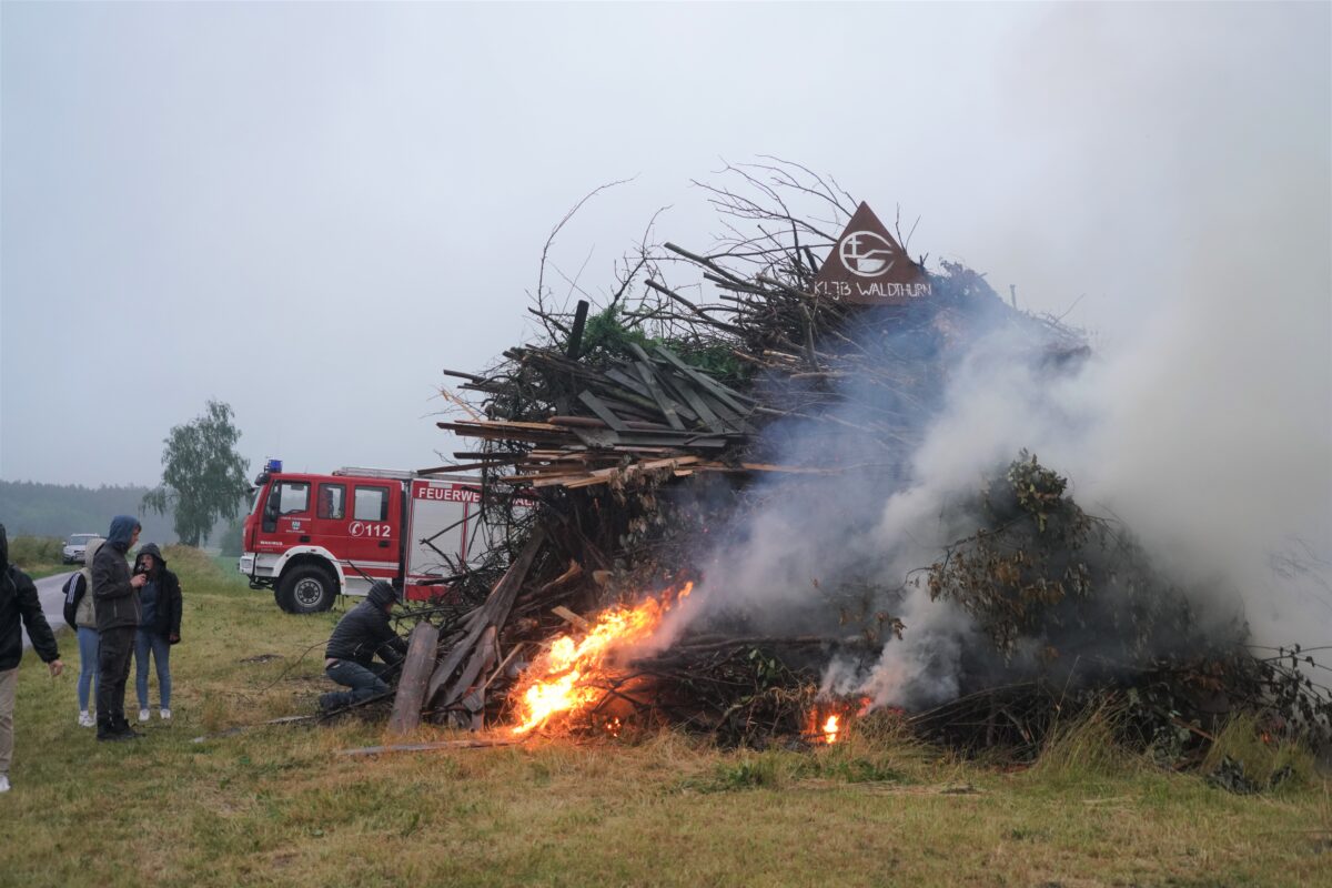 Pfarrer Norbert Götz segnete das Feuer. Für Sicherheit sorgte die Waldthurner Feuerwehr mit Unterstützung einiger Aktiven der Spielberger Feuerwehr. Anfangs entzündete sich des Johannisfeuer wegen des Regens etwa „zäh“.