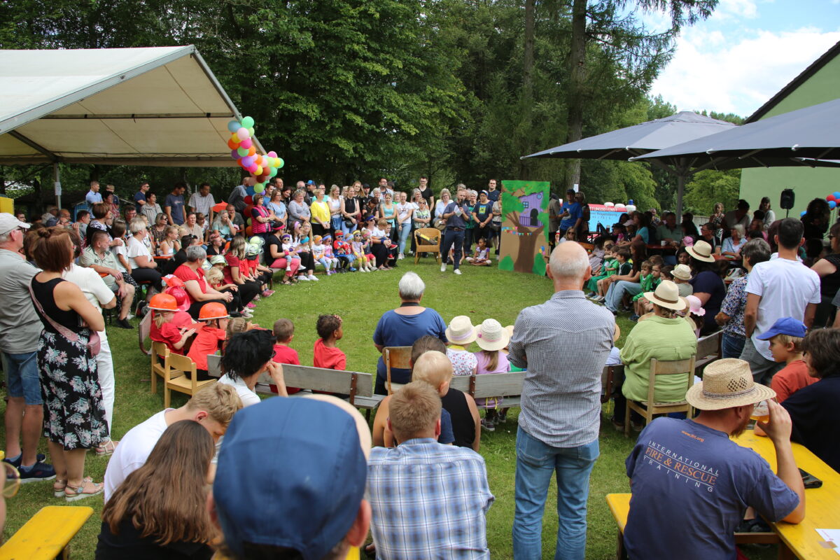 Dann aber standen die Kinder im Mittelpunkt. Diese hatten eine fantasievolle Aufführung mit ihren Erzieherinnen und Erziehern über viele Wochen einstudiert. Mit der erfreuten sie die zahlreichen Eltern und Verwandten bei strahlendem Sonnenschein im Garten der Einrichtung. Die Eltern hatten fleißig Kuchen gebacken und der Elternbeirat bewirtete die zahlreichen Gäste mit Grillspezialitäten. Am Abend sorgte dann noch eine Schülerband für tolle Stimmung und rundete die Geburtstagsfeier perfekt ab.