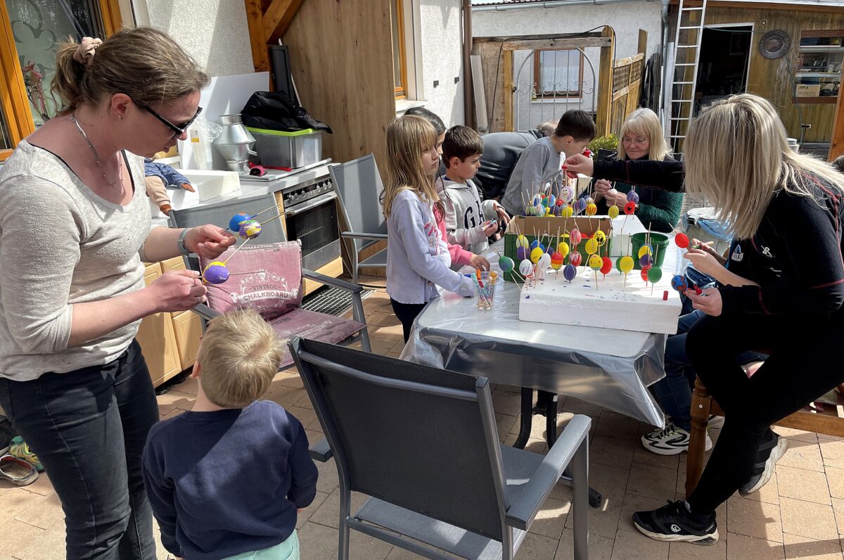Doch der Tag war damit noch nicht vorbei. Frisch gestärkt griffen vor allem die Kinder zu Pinseln und Farben. Bereits vorbereitete, ausgeblasene Ostereier verwandelten sie mit viel Fantasie in kleine Kunstwerke. Die sogenannten Ersatzeier sollen im kommenden Jahr den Weidener Osterbrunnen mitschmücken. Da echte Eier beim beliebten Schmuck des Brunnens immer wieder beschädigt werden, sorgt der Nachwuchs regelmäßig für Nachschub. Kunststoff kommt nicht infrage, Handarbeit ist gefragt. Genau hier springen die Brandweiherkinder ein und gestalten farbenfrohe Ersatzstücke für den Heimatring.