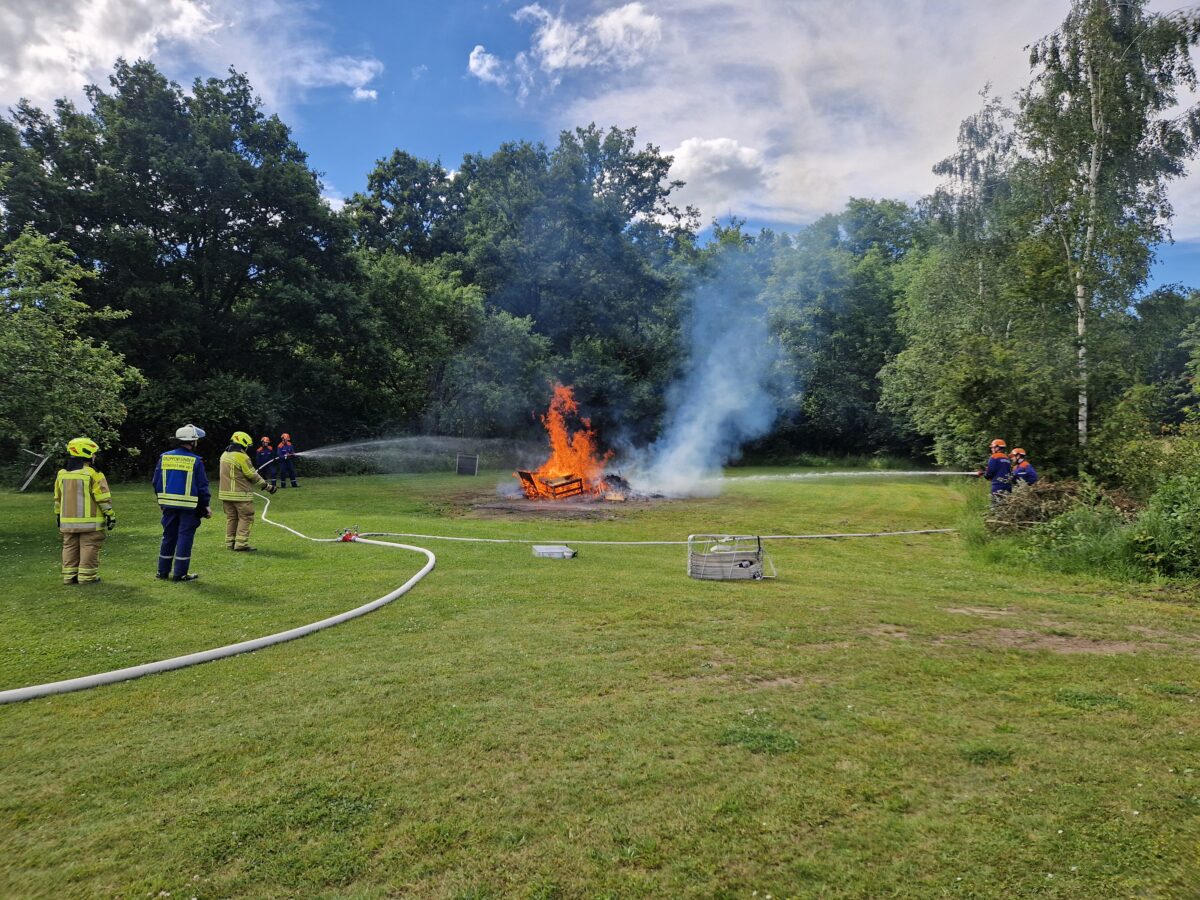 Highlight des ersten Tages war der Brandeinsatz beim Eisstockheim. Ein Holzstapel war in Brand geraten. Mit einem Löschangriff von zwei Seiten war das Feuer schnell unter Kontrolle gebracht. Weitere Einsatzübungen absolvierten die Jugendlichen mit Bravour. Brandmeldeanlage Grundschule, Personenrettung und Personensuche erledigten die Nachwuchsfeuerwehrler ohne Problem. An der Haidmühle beseitigte die Gruppe eine Ölspur.