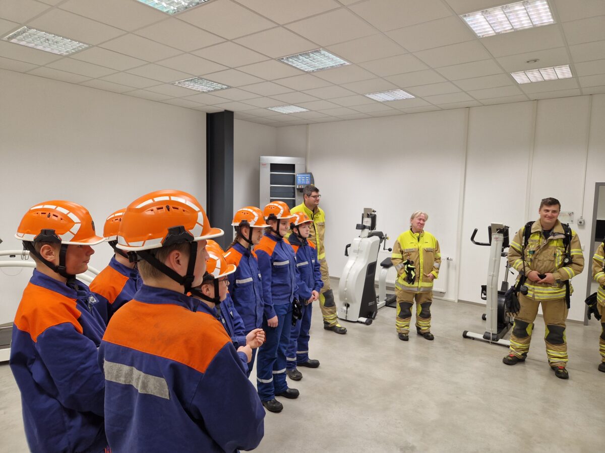 Nach dem anschließenden Mittagessen fuhren die Jugendlichen zur Besichtigung der Atemschutzstrecke nach Neuhaus. Die Kreisbrandmeisterin Carola Adam und Atemschutzausbilder Jürgen Wolf von der Feuerwehr Schirmitz führten durch die Anlage und gaben eine kurzweilige Einweisung in den Ablauf eines Streckendurchganges. Natürlich durften die Jugendlichen auch verschiedenen Arbeitsmessgeräte wie Endlosleiter, Laufband, Fahrradergometer testen. Höhepunkt war die Besichtigung und Absolvierung der Orientierungsstrecke Neuhaus. Auch diese Aufgabe bewältigten die Jugendlichen.