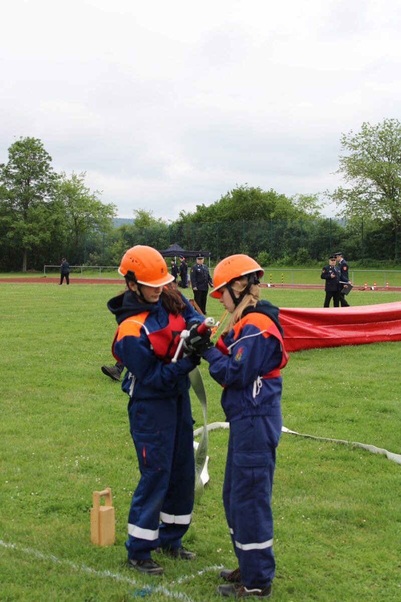 Sowieso lauerten Fehlerquellen an jeder Ecke, die die Wertungsrichter mit strengem Blick verfolgten und notierten. Im zweiten Teil, dem sogenannten B-Teil galt es ebenfalls, ordentlich Punkte zu sammeln. 400 Meter Hindernislauf standen auf dem Programm. Eine Krankentrage, ein C-Schlauch, ein Strahlrohr oder eine Feuerwehrleine mussten transportiert und entsprechend der Aufgabe verwendet werden, beispielsweise wurde das Strahlrohr mit der Leine abgesichert.