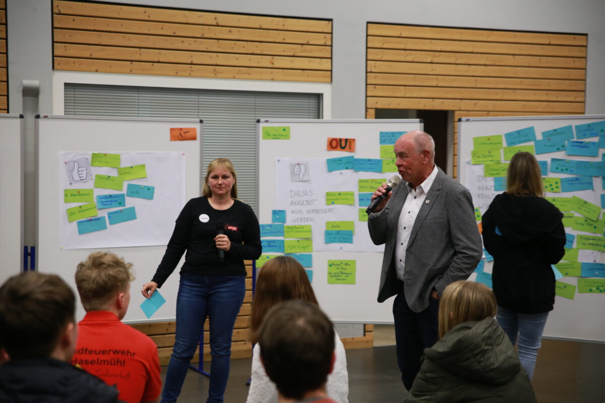 Am Ende stach dabei ein Anliegen heraus: der Wunsch nach besserem Internet – sowohl mobil als auch lokal. Umgehend stellte Bürgermeister Roland Strehl fest, dass es bereits an verschiedenen Standorten das öffentliche Bayern-WLAN, welches genutzt werden kann, gibt. Die Moderatorin sprach zusammen mit dem Kümmersbrucker Bürgermeister die Themen nacheinander durch, welche am häufigsten von den Jugendlichen notiert und als besonders wichtig markiert wurden.