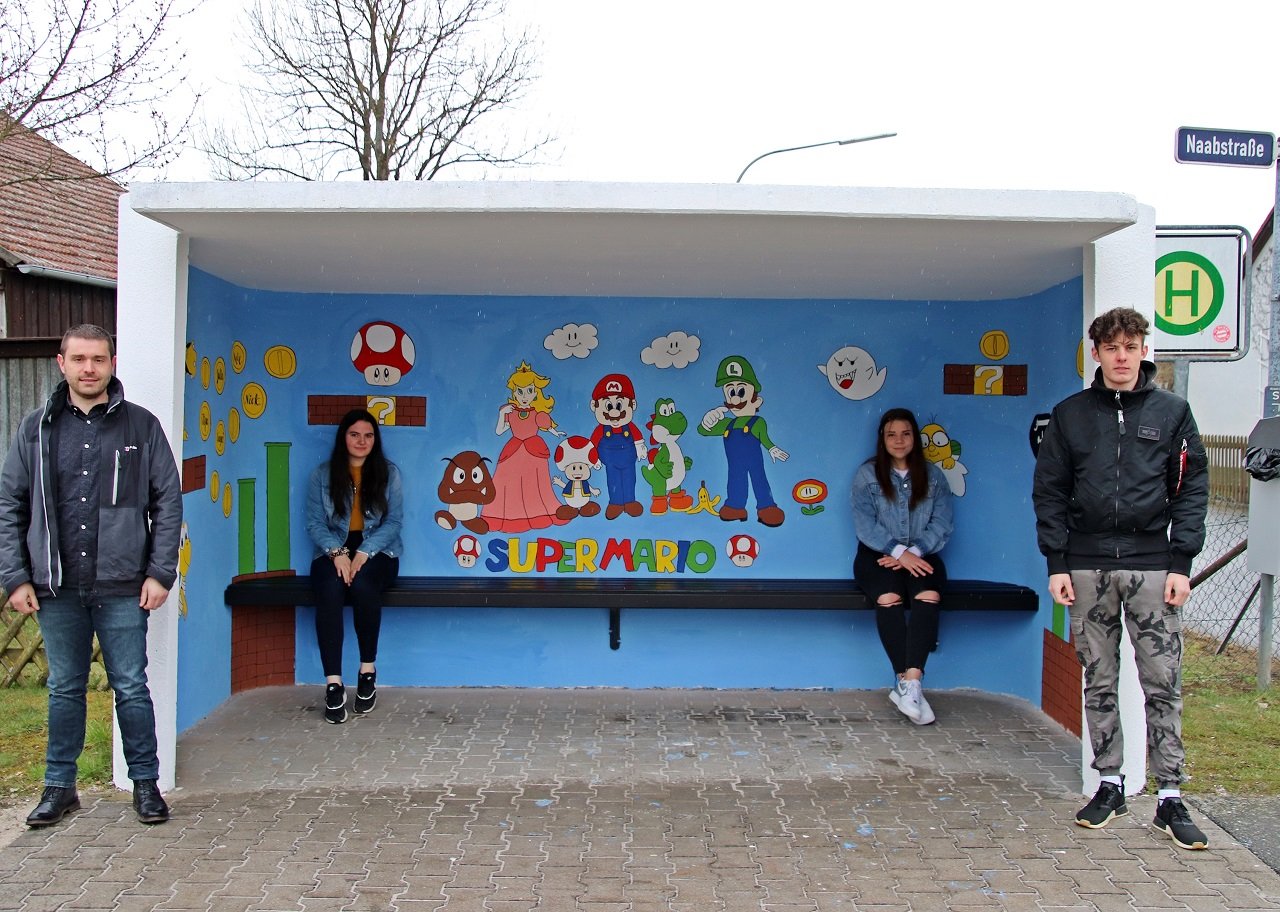 „Ich hab das finanzielle und organisatorische im Hintergrund geregelt und dann konnten wir loslegen“, sagt Eckert. Die Teenager haben die alte Farbe weitestgehend abgekratzt, eine neue Grundierung aufgebracht und alles neu weiß gestrichen. „Da wir viel auf einer Konsole spielen, haben wir uns für diese Motive entschieden“, sagt Nele Hänisch, während sie ihren Blick über das gemeinsame Kunstwerk schweifen lässt: Super Mario, seine Freunde und allzu beliebte Nintendo-Spieldetails setzen ab sofort das Dießfurter Bushäuschen in Szene.