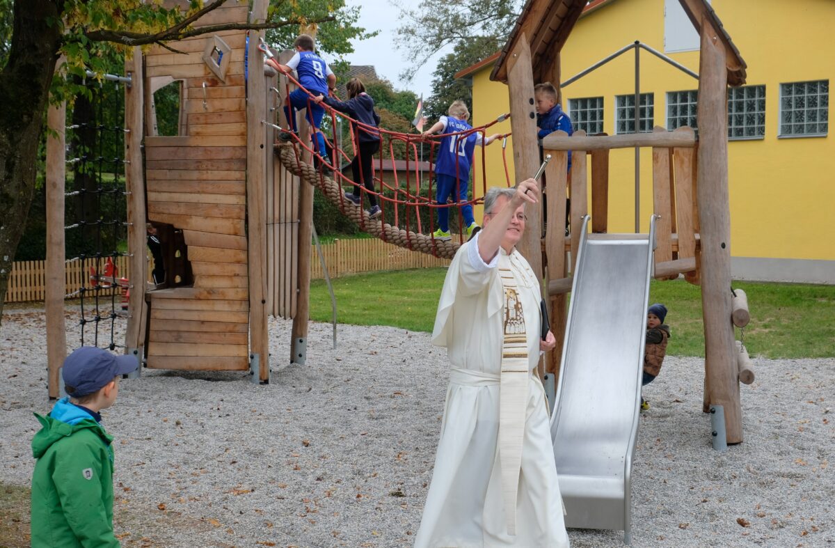 Es folgte die Segnung des neuen Spielplatzes. Nach Abschluss der Restarbeiten für das Kinderparadies zwischen Schulstraße und Biberbach, mit einer vielfältigen Spielgeräteauswahl attraktiv gestaltet, war die offizielle Einweihung längst überfällig. Gleich nebenan warteten schon die jungen Kicker ungeduldig auf die Eröffnung der „Biwara Soccer-Arena“. Dabei handelt es sich um ein 20 mal 13 Meter großes Kunstrasen-Spielfeld. „Sich regen bringt Segen“, lautete der etwas andere Segensspruch von Pater Adrian. Der Seelsorger betrachtete die neue Sportmöglichkeit als Lernfeld für angewandtes Mensch- und Christsein.