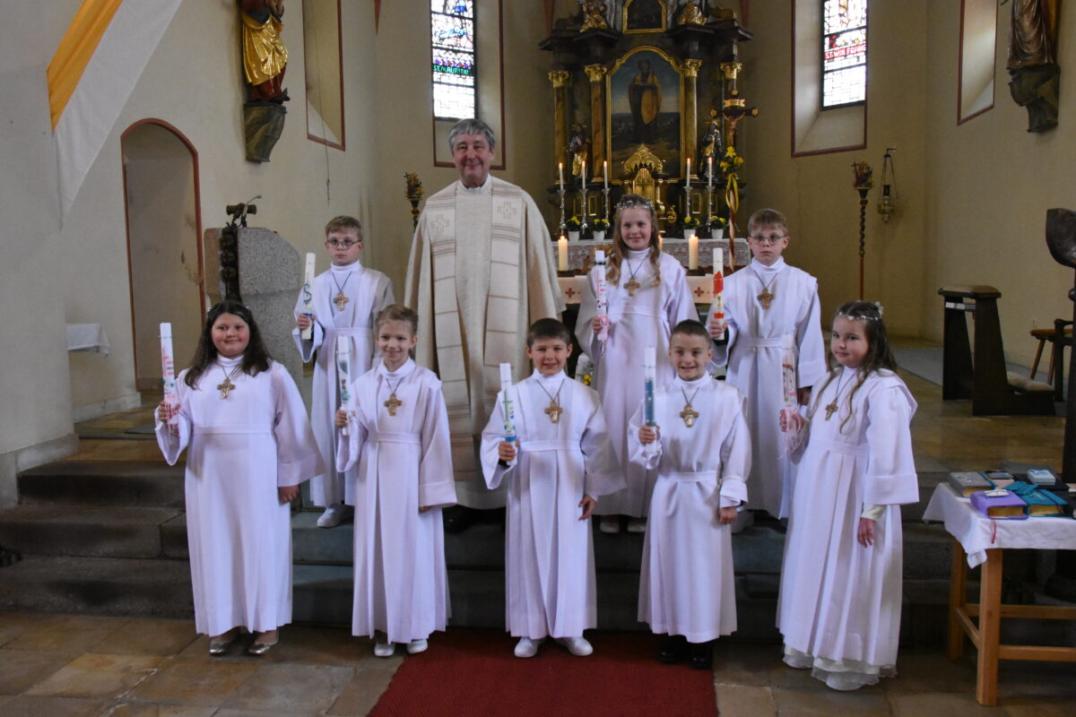 zum ersten Mal zum Tisch des Herrn gehen. Pfarrer Adam Nieciecki holte mit den Ministranten zuvor die Kommunionkinder mit ihren Eltern und Paten vom Dorfkreuz ab und geleitete sie in das festlich geschmückte Gotteshaus. In seiner Predigt sprach der Priester das Motto der Erstkommunion an, „Du gehst mit.“ Dabei gab er den Kindern mit auf den Weg, dass sie von nun an nicht allein sind, sondern mit Jesus stets einen Freund an ihrer Seite haben.