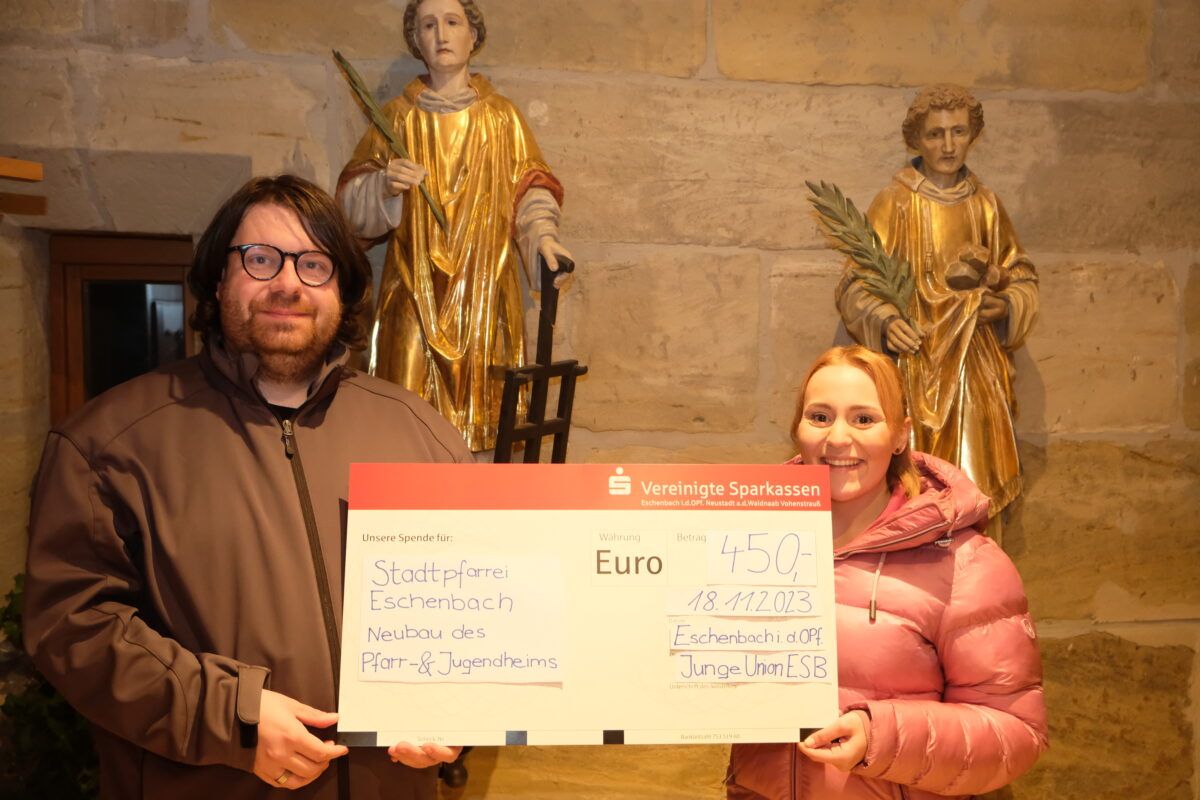 Katharina Diertl, Ortsvorsitzende der Jungen Union, besuchte Stadtpfarrer Johannes Bosco in der Sakristei der Pfarrkirche, um eine frohe Botschaft zu überbringen. Diertl überreichte dem Ortspfarrer im Namen der JU-Vorstandschaft eine Geldspende in Höhe von 450 Euro als kleinen Beitrag für den Neubau des Pfarrheims. Die Spendensumme stammt aus dem Reingewinn der Einnahmen des Bürgerfest-Standes und der Servicestation aus Anlass des Johannisfeuers.