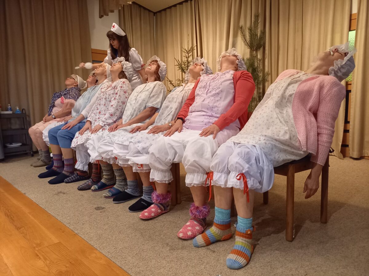 Fester Bestandteil des Kaffeekränzchens bildet stets ein Beitrag des Katholischen Frauenbundes. Diesmal nahmen die Frauen die „Sparmaßnahmen im Altenheim“ aufs Korn, indem sie eine Alltagssituation in einem Altenheim darstellten, das mit sichtlich extrem knappen Mitteln wirtschaften muss: Es wird gespart, wo es nur geht. Und so mussten sich die Bewohnerinnen zu acht eine Zahnbürste teilen, was für schallendes Gelächter im Publikum sorgte.