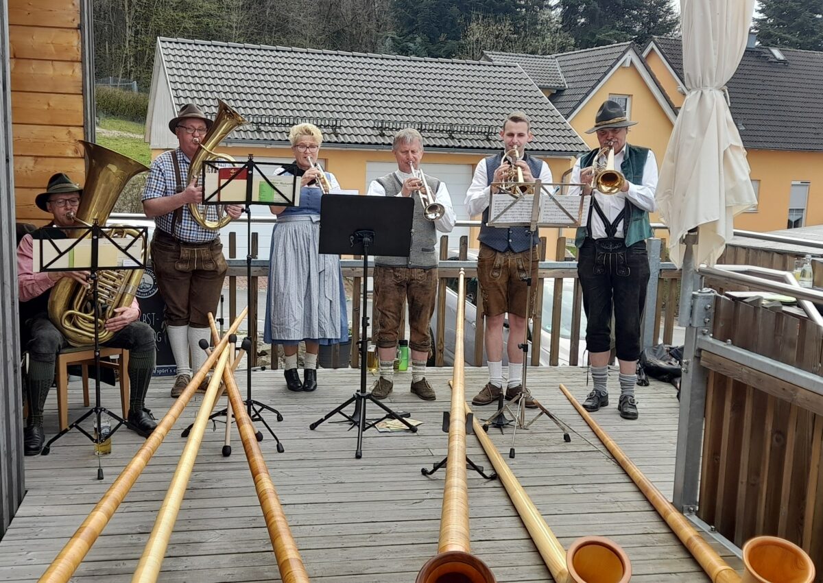 Zum bayerischen Weißwurst-Frühschoppen verpflichtete Pöpperl die Alphorngruppe der Hahnbacher Marktbläser, die mit ihren imponierenden, etwa vier Meter langen Instrumenten den typischen Alpensound zum Besten gaben. Stücke, wie die Alfons-Polka, Jager Ruef, oder Tiger-Rag gepaart mit sonnigem Wetter und der wunderbaren Aussicht auf den kleinen Kulm ließen an einen Besuch einer Almhütte im Voralpenland erinnern. Das ist auch ein Faible des Wirtes, der, wenn er Zeit hat, zu Wanderungen aufbricht. Daher dürfen kulinarische Ausflüge in die österreichische oder alpenländische Küche nicht fehlen. Auch Events, wie Pizzaabend oder Handwerkermarkt sind bereits in Planung.