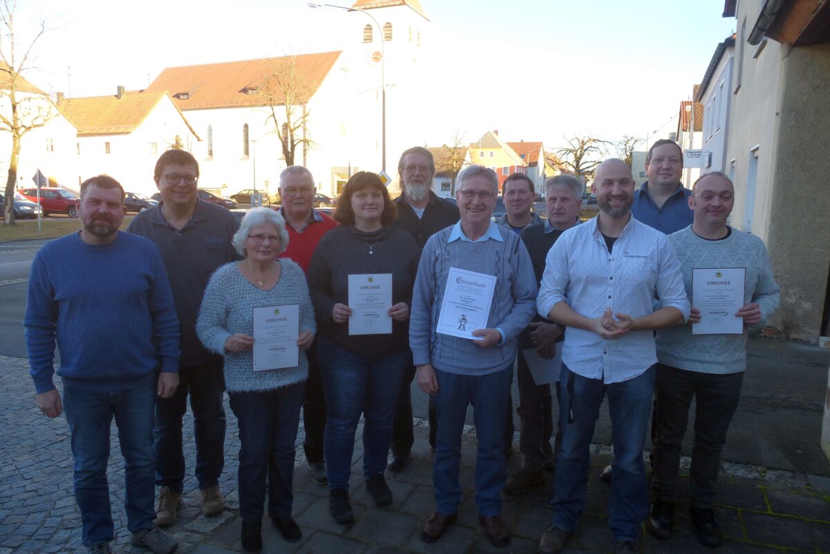 Kreisvorsitzender Erl und IBZV-Vize Bernhard Wurzer übergaben Urkunde und Ehrennadel in Bronze des Deutschen Imkerbunds an Barbara Ram, Manfred Bergler, Hans Reichl und Stefanie Werner. Silber erhielten Ernst Müller und Andreas Neumann. Nachgereicht wird die Auszeichnung an Thomas Schertl, Tobias Pröls, Martin Beutner (Bronze), an Peter Forster, Alfons Fehlner (Silber).