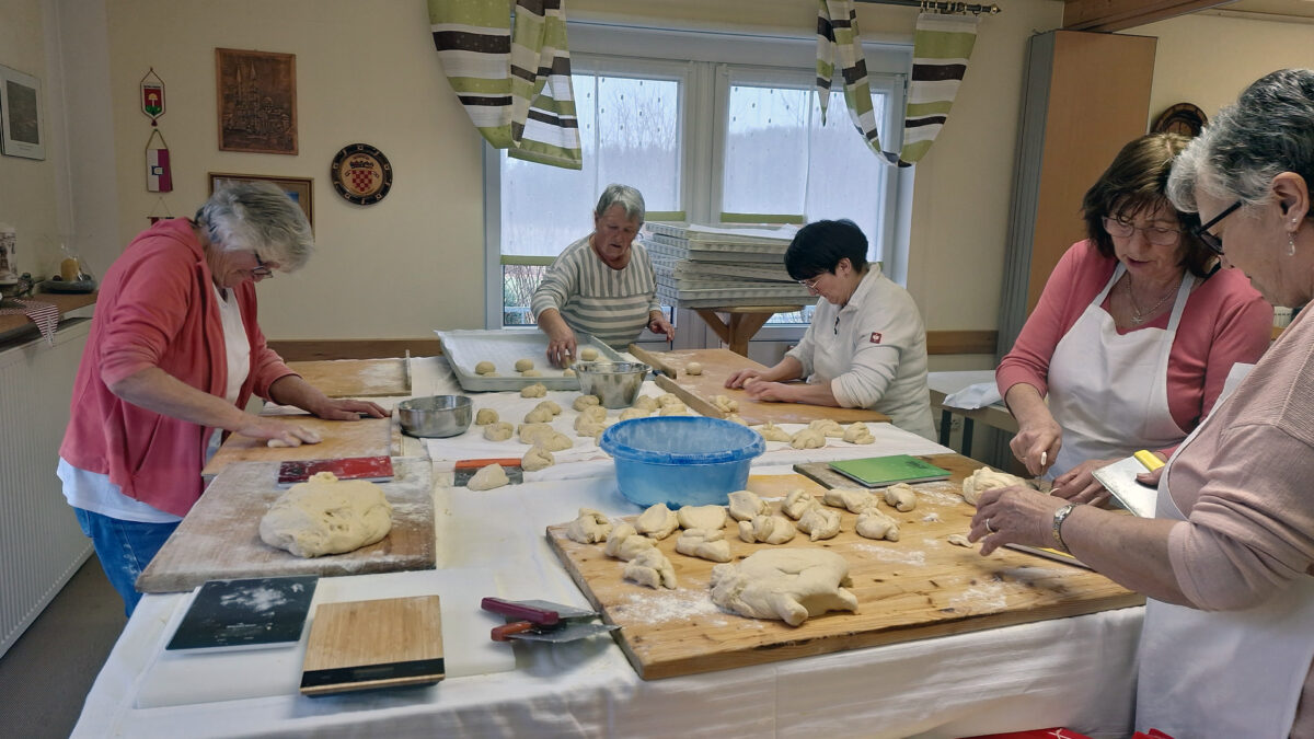 Das erfahrene Team, das schon in den frühen Morgenstunden ehrenamtlich ans Werk ging, verarbeitete dabei unter anderem 1000 Eier, 38 Kilogramm Butter, 23 Kilogramm Hefe und 40 Kilogramm Zucker. Aus diesen großen Mengen wurde mehrmals Teig gemischt und geknetet. Schon früh konnten die ersten Kunden kommen, um sich für den Nachmittagskaffee einzudecken.