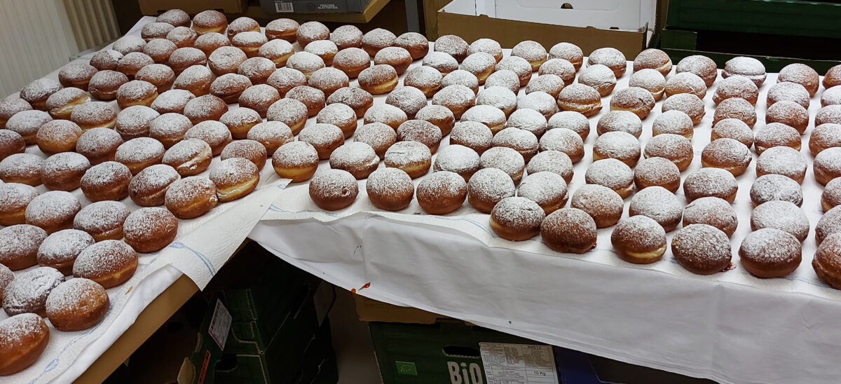 Bereits zum 14ten Mal in Folge fanden sich freiwillige Helfer unter der Regie von Birgit Strauß und Organisatorin Michaela Zeitler ein, um zusammen in einer großangelegten Aktion das leckere Schmalzgebäck zu produzieren. An zwei aufeinanderfolgenden Tagen arbeiteten 20 Frauen und fünf Männer jeweils zwölf Stunden lang, um die lange Bestellliste abzuarbeiten. Selbst drei Jugendliche halfen vor der Schule für den guten Zweck mit.