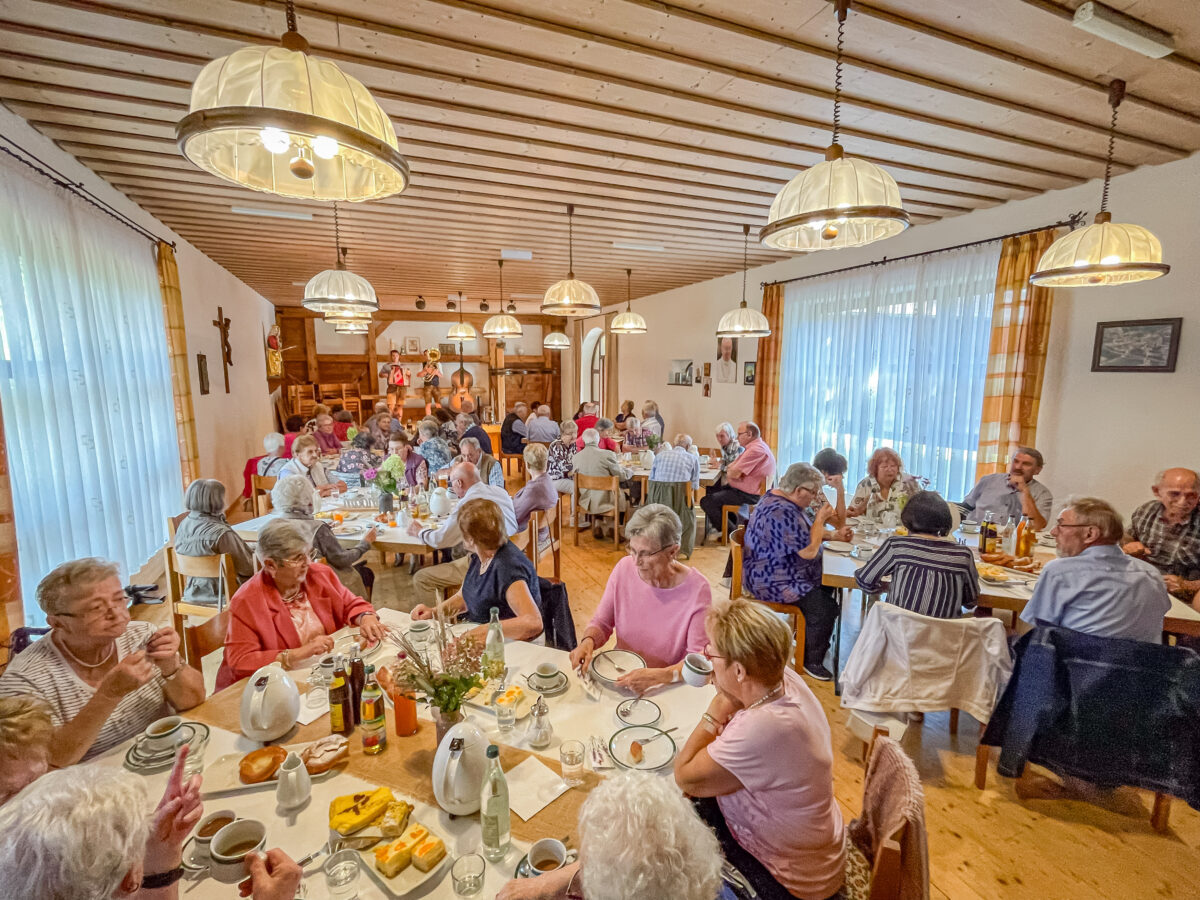 Für die musikalische Stimmung sorgten die “Feierhaisl-Buam”, ein Duo bestehend aus Maximilian Miedel aus Scheckenhof und Sebastian Plössner aus Filchendorf. Mit Quetschn, Tuba und Kontrabass brachten sie traditionelle Klänge in den Saal, die zum Mitsingen und Mitschunkeln einluden. Der Höhepunkt des Nachmittags war der Auftritt des Zauberers Marius Koslowski. Er begeisterte das Publikum sowohl auf der Bühne als auch direkt an den Tischen mit seinen verblüffenden Tricks und feinsinnigem Humor. “Wie macht er das nur?” war die Frage, die sich viele stellten, aber das Geheimnis seiner Kunststücke blieb ungelüftet.