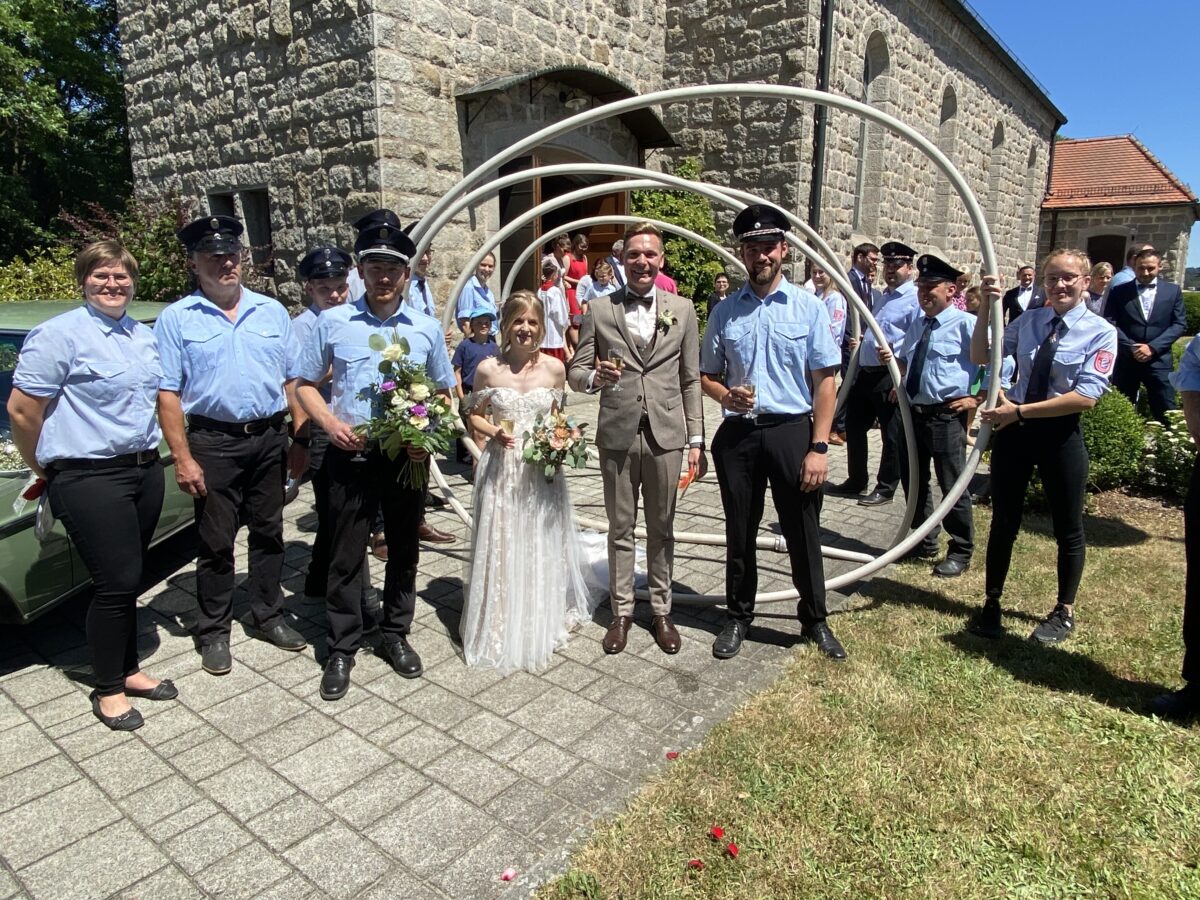 Nachdem Sebastian, einer der Chefs der Öko-Ranch in Pfreimd, neben seiner Leidenschaft für Oldtimer, aktives Mitglied der Freiwilligen Feuerwehr Kleinschwand ist, musste er auch mit seiner Braut durch eine von seinen Feuerwehrkameraden aufgestellte Schlauchspirale. Belohnt wurden beide mit einem kühlen Glas Sekt.