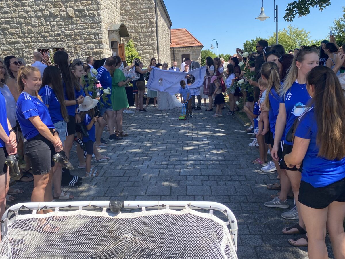 Wie sie ihre Trainerin schätzen, bewiesen die C-Juniorinnen vom SV Altenstadt, wo sie auch mehrere Jahre in der Damenmannschaft gespielt hat. Die gesamte Mannschaft war angetreten und bildete mit ihren „Fußballtretern“ ein Spalier. Den fälligen Freistoß brachte sie zielsicher im Tor unter.