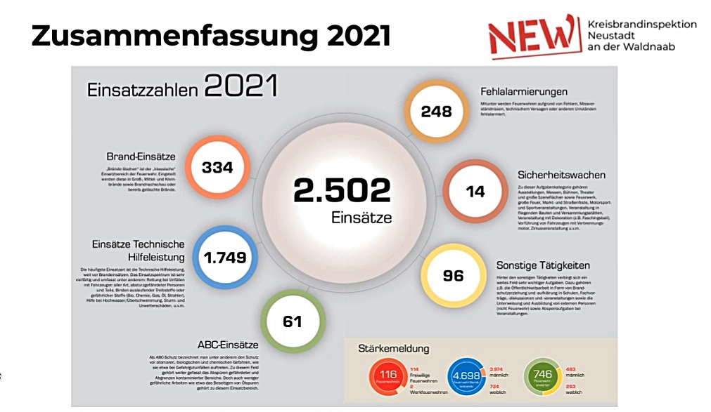 Kreisbrandrat Marco Saller präsentierte die Jahresstatistik der Kreisbrandinspektion Neustadt/WN für das Jahr 2021 – Coronabedingt online. Demnach mussten die Feuerwehren 2021 im Landkreis 2.502 Einsätze absolvieren. „Dazu zählt jede Freiwillige und jede Werksfeuerwehr“, betonte der Kreisbrandrat. Im Vergleich zu 2020 (2446) ist dies eine geringe Steigerung von circa zwei Prozent.