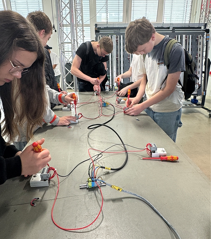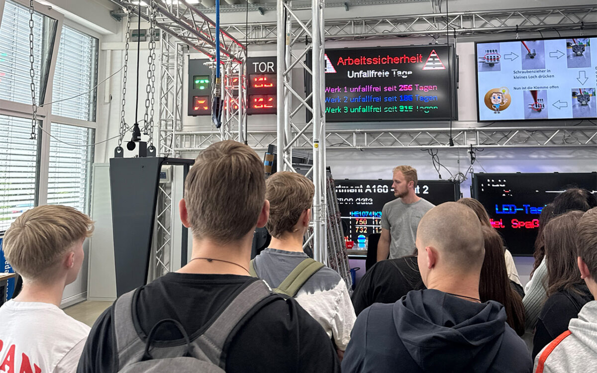 Ausbilder Florian Helgert übernahm für den Bereich Elektronik. Er stellte den zugehörigen Ausbildungsberuf Elektroniker/-in für Geräte und Systeme (m/w/d) vor. Bei einer Führung durch die Fertigung bekamen die Schüler nicht nur einen Einblick ins Produktionsgeschehen, sondern lernten auch die Vielfalt verschiedener Anzeige- und Kommissioniersysteme kennen. Um einen ganz eigenen, praxisnahen Bezug herzustellen, hatte Helgert vorab einen Schaltplan vorbereitet – Interessierte konnten Hand anlegen und hier ihr Geschick sowie technisches Verständnis beim Aufbau einer LED-Schaltung prüfen.