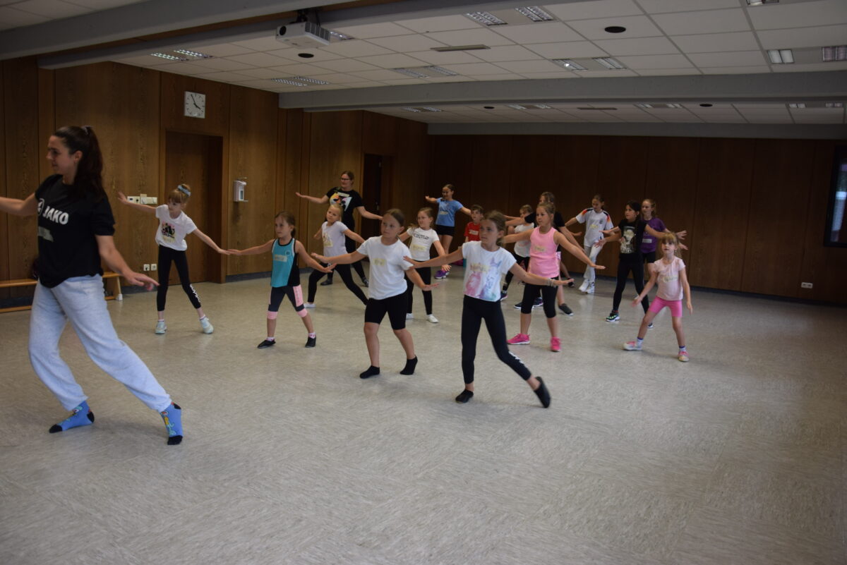 Unter der Leitung von Lisa Prem und Katharina Meyer, die den Kindern bei ihrer Ankunft einen kurzen Überblick über den geplanten Ablauf gaben, war der Nachmittag gekennzeichnet von Tanz, Musik und großer Begeisterung. Zu den Klängen von “Fireworks” von Purple Disco Machine erarbeiteten die Kinder eine anspruchsvolle Choreografie, die von den beiden Trainerinnen sorgfältig angeleitet wurde. “Kindgerecht, mit vielen Wiederholungen und einigen Trinkpausen wurde die Choreo erarbeitet. Immer wieder ertönte: ‘…und 5, 6, 7, 8 und…’ – mal ging es um einen ‘Slide’ nach vorne, die Arme mussten nach oben geführt werden oder die Kinder sollten einen Schritt zurückgehen und die Arme in einer ‘Schwimmbewegung’ kreisen”, so die Beschreibung des Workshops.