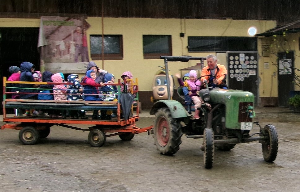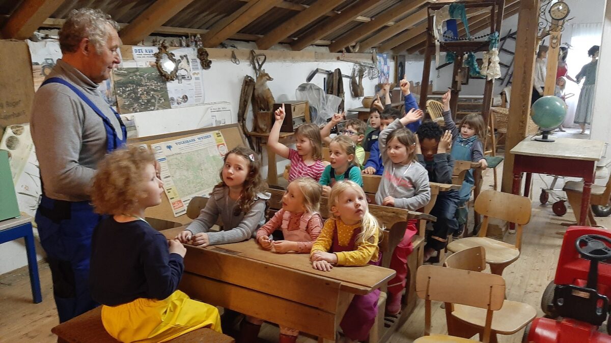 Nächste Station war der ehemalige Getreideboden, dort wurde mit den Bobbycars und Tretfahrzeugen ein Wettrennen veranstalten. Im „Stodl“ wurde Schule gespielt und die Kinder haben die Quiz-Fragen von „Bauer Fritz“ über die vielen Tiere, die sie gesehen haben, gekonnt beantwortet.