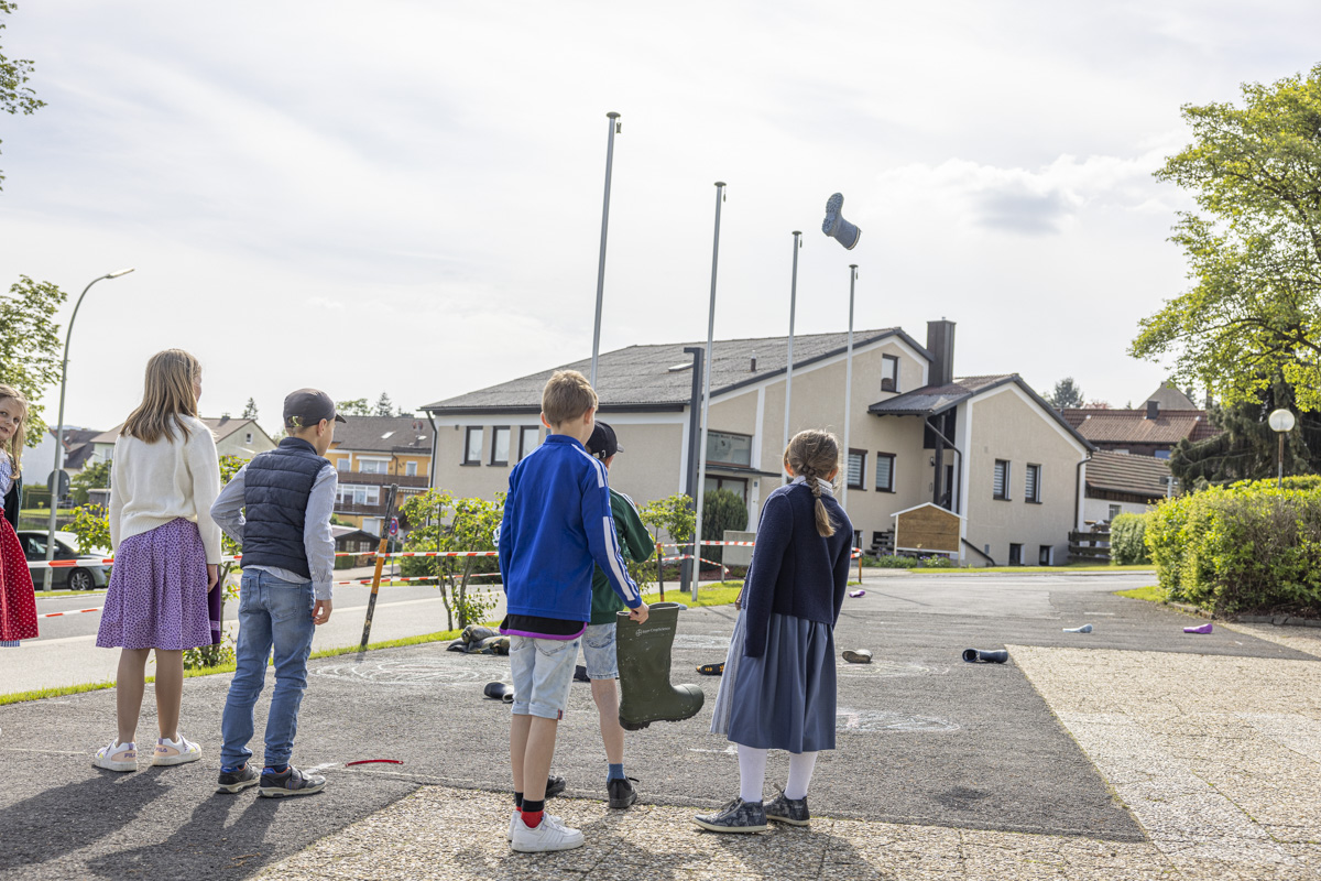 Die Kinder hatten reichlich Möglichkeit, sich an den verschiedenen Spielstationen auszutoben. Hier wurden Maßkrüge gestemmt, Nägel in Baumstämme genagelt, Bälle und Gummistiefel geworfen oder beim Tauziehen gegeneinander angetreten.