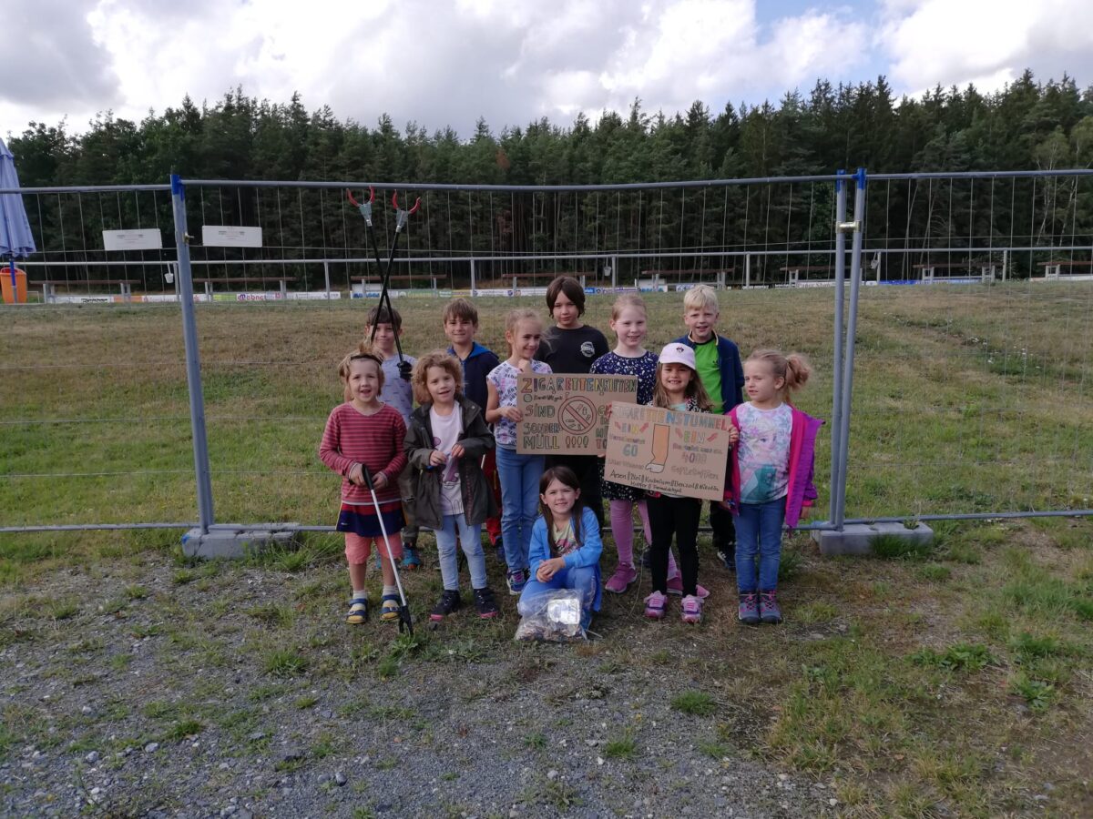 Im Anschluss wurde rund um den Schwarzenbacher Sportplatz mit Greifzangen und Pinzetten nach weggeworfenen Zigarettenkippen gesucht. Mit großer Begeisterung machten sich die Kinder auf den Weg und es konnte eine überraschend große Anzahl von Zigarettenstummeln gefunden werden, welche dann ordnungsgemäß im Müll entsorgt wurden.