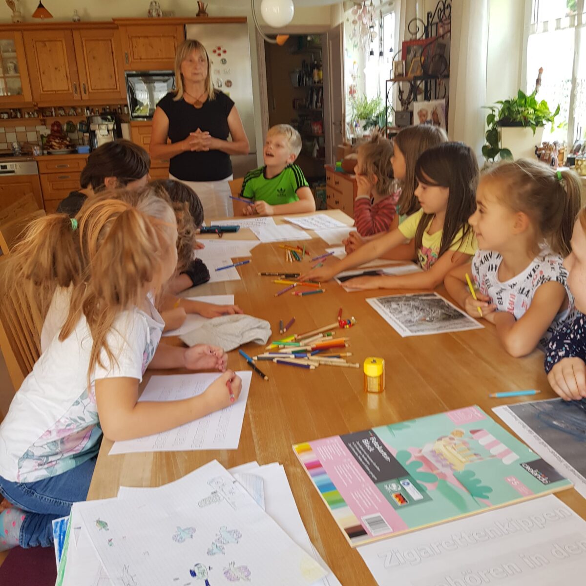 Mit Buntstiften durfte nun vorbereitetes Arbeitsmaterial ausgemalt und gestaltet werden. Dabei wurde den Kindern erklärt, welche großen Gefahren von Zigarettenkippen ausgehen. Sie wissen jetzt, dass diese als giftiger Sondermüll gelten, weil sich darin Schwermetalle und andere Schadstoffe befinden, die Seen, Flüsse und Gewässer verseuchen und Kleinstlebewesen und Pflanzen töten können.