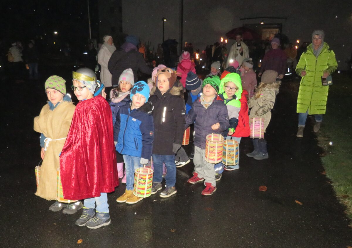 Das Martinfest des katholischen Kindergartens Arche Noah begann mit einer kleinen Andacht in der Pfarrkirche zur Heiligen Familie. Nach dem Eingangslied sprach Pfarrer Thomas Kopp einleitende Worte. Er nannte St. Martin als leuchtendes Beispiel der Nächstenlieben. Er erinnerte daran, dass jeder Mensch im Leben so sein kann wie der heilige Martin. Beim Spiel zeigten die Kinder die Geschichte des heiligen Martin. Der Heilige teilte mit einem Bettler den Mantel, damit er nicht in der Kälte des Winters erfriert.