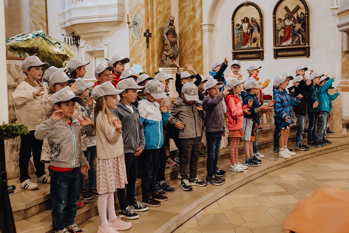 Im Anschluss an die Krippenandacht versammelten sich alle Kinder des Bereichs Kindergarten, die Familien der Vorschulkinder sowie das pädagogische Team in der Stadtpfarrkirche zur feierlichen Verabschiedung der angehenden Schulkinder. Auch diese Andacht wurde von Herrn Dekan Hösl geleitet und stand unter dem bewegenden Thema „Verlass dein Nest und fliege“.